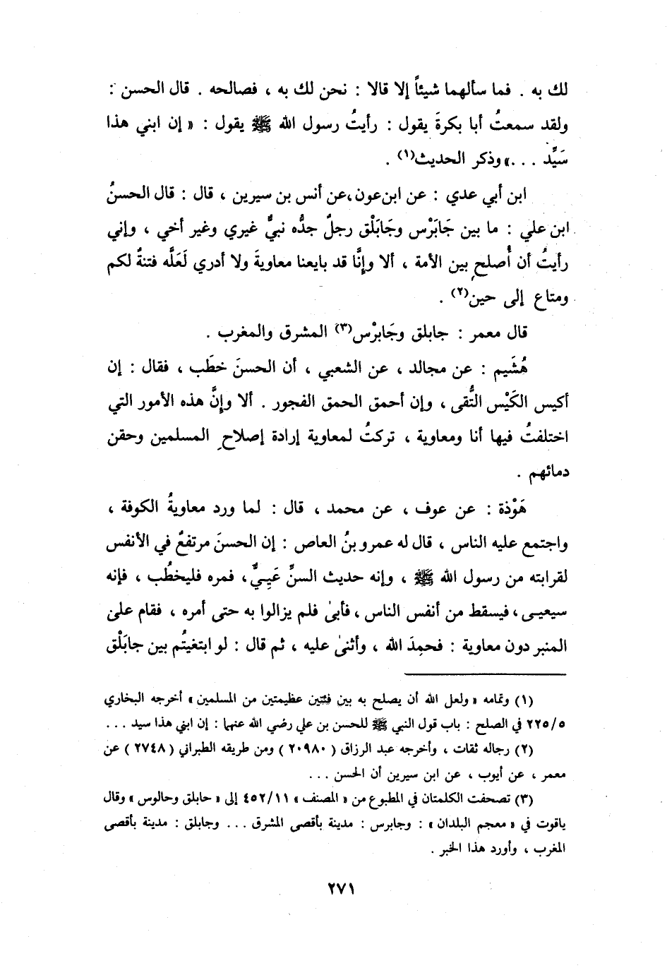 قَالَ الحَسَنُ بنُ عَلِيٍّ: مَا بَيْنَ جَابَرْسَ وَجَابَلْقَ رَجُلٌ جَدُّهُ نَبِيٌّ غَيرِي وَغَيرَ أَخِي، وَإِنّي رَأَيْتُ أَنْ أُصلِحَ بَيْنَ الأُمَّةِ، أَلاَ وَإِنَّا قَدْ بَايعنَا مُعَاوِيَةَ، وَلاَ أَدْرِي لَعَلَّهُ فِتْنَةٌ لَكُم وَمَتَاعٌ إِلَى حِيْنَ (2) .