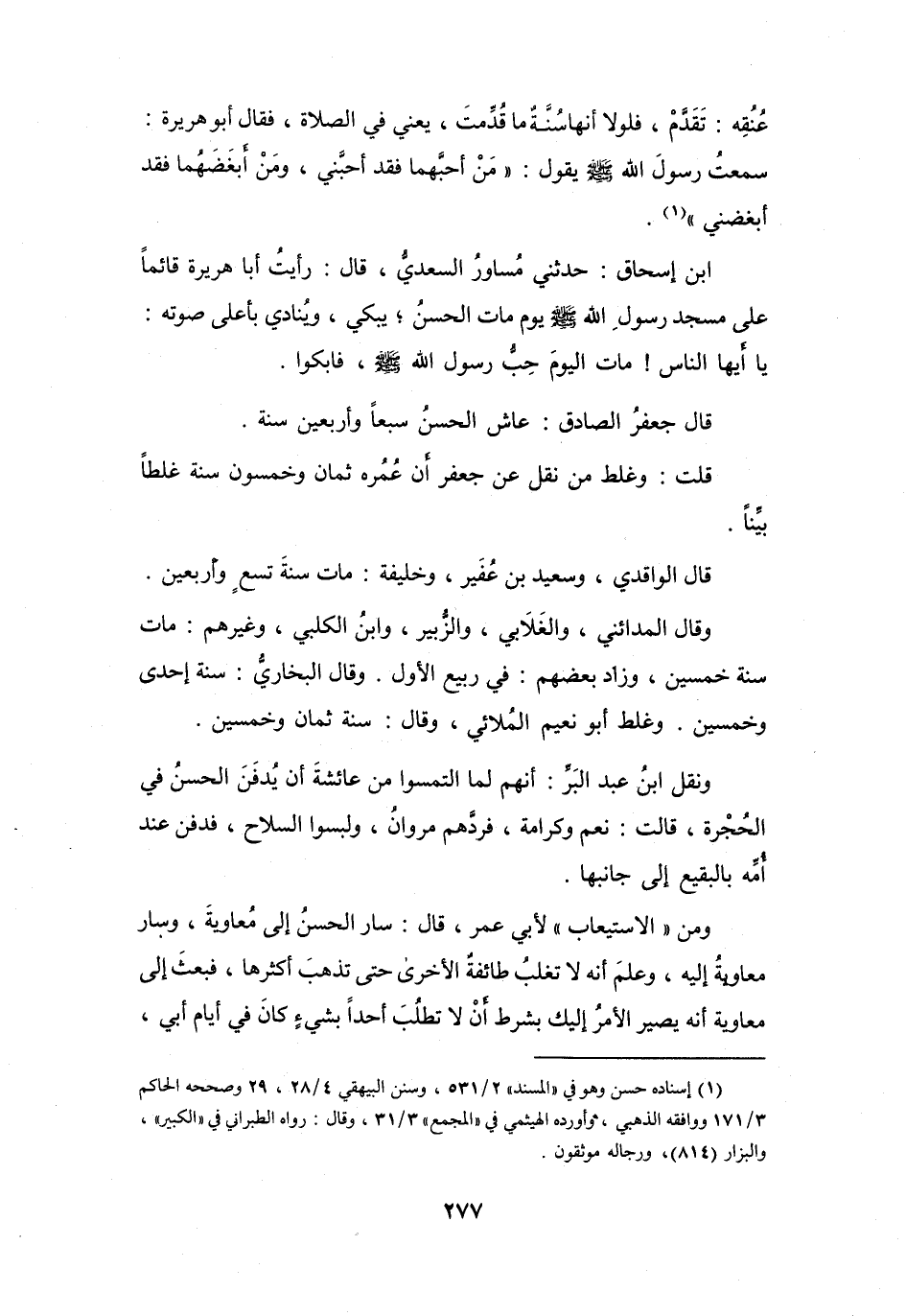 رَأَيْتُ أَبَا هُرَيْرَةَ قَائِماً عَلَى مَسجدِ رَسُوْلِ اللهِ -صَلَّى اللَّهُ عَلَيْهِ وَسَلَّمَ - يَوْمَ مَاتَ الحَسَنُ؛ يَبْكِي، وَيُنَادِي بِأَعلَى صَوْتِهِ: يَا أَيُّهَا النَّاسُ! مَاتَ اليَوْمَ حِبُّ رَسُوْلِ اللهِ -صَلَّى اللَّهُ عَلَيْهِ وَسَلَّمَ - فَابْكُوا.