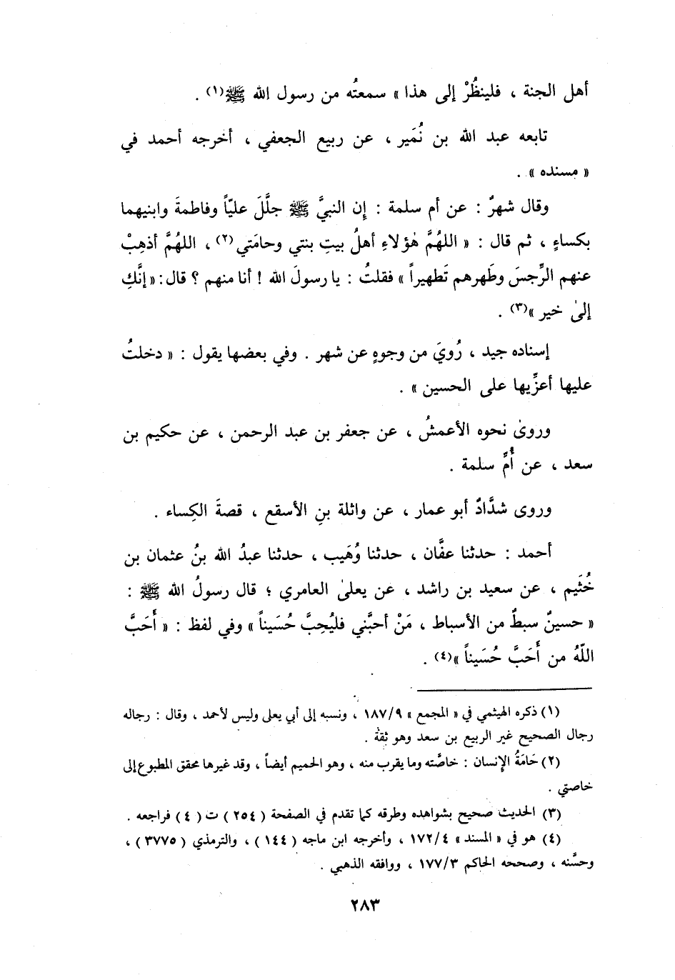إِنَّ النَّبِيَّ -صَلَّى اللَّهُ عَلَيْهِ وَسَلَّمَ - جَلَّلَ عَلِيّاً وَفَاطِمَةَ وَابْنَيْهِمَا بِكسَاءٍ، ثُمَّ قَالَ: (اللَّهُمَّ هَؤُلاَءِ أَهْلُ بَيْتِ بِنْتِي وَحَامَتِي (2) ، اللَّهُمَّ أَذْهِبْ عَنْهُمُ الرِّجْسَ، وَطَهِّرْهُمْ تَطْهِيْراً) .