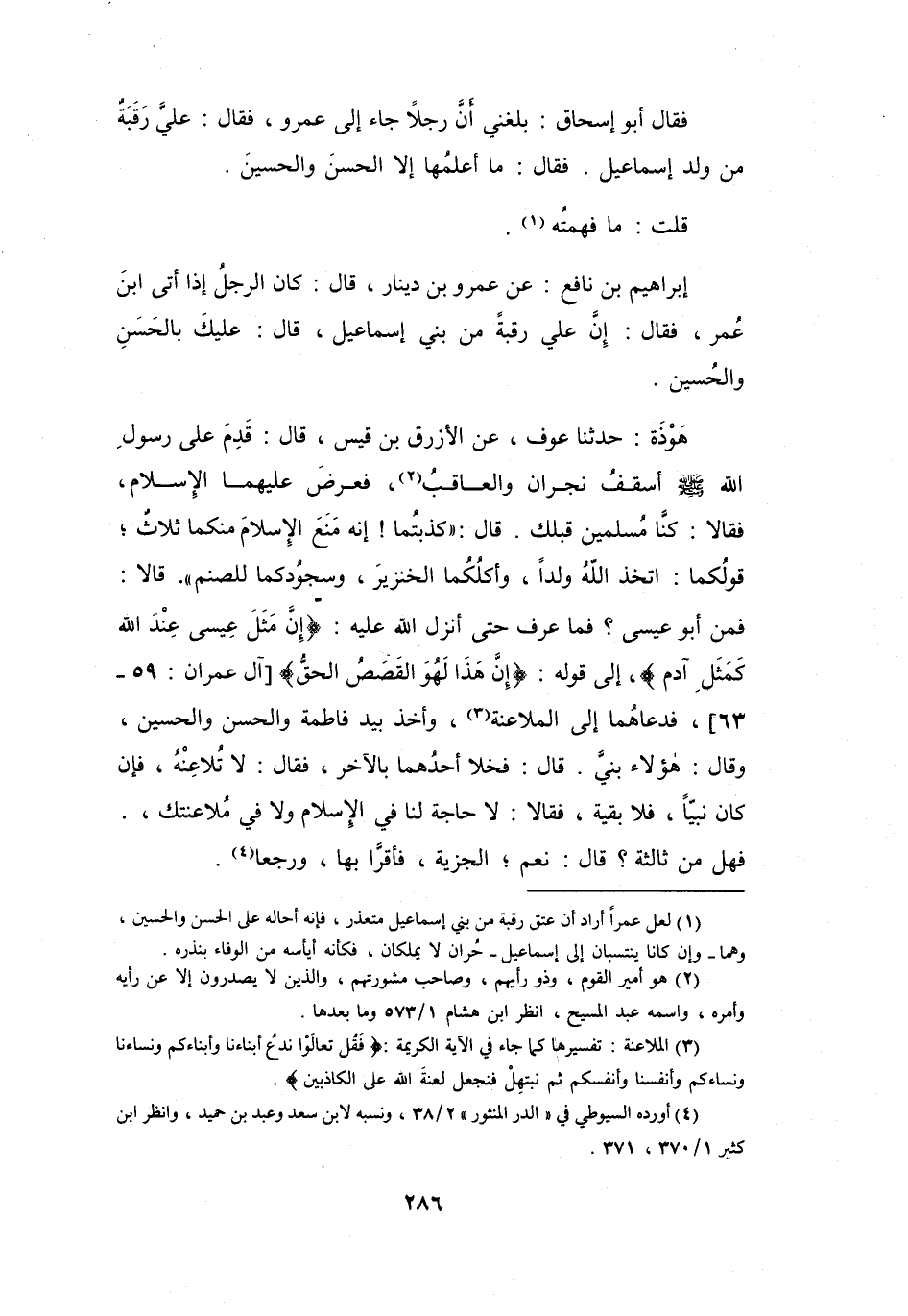 (1) لعل عمرا أراد أن عتق رقبة من بني إسماعيل متعذر، فإنه أحاله على الحسن والحسين، وهما - وإن كانا ينتسبان إلى إسماعيل - حران لا يملكان، فكأنه أيأسه من الوفاء بنذره.