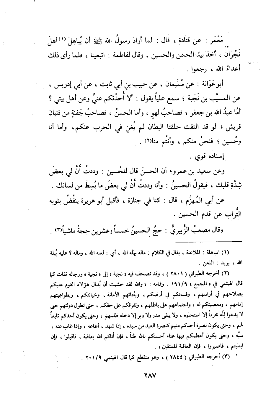لَمَّا أَرَادَ رَسُوْلُ اللهِ -صَلَّى اللَّهُ عَلَيْهِ وَسَلَّمَ - أَنْ يُبَاهِلَ (1) أَهْلَ نَجْرَانَ، أَخذَ بِيَدِ الحَسَنِ وَالحُسَيْنِ، وَقَالَ لِفَاطِمَةَ: (اتْبَعِيْنَا) .
