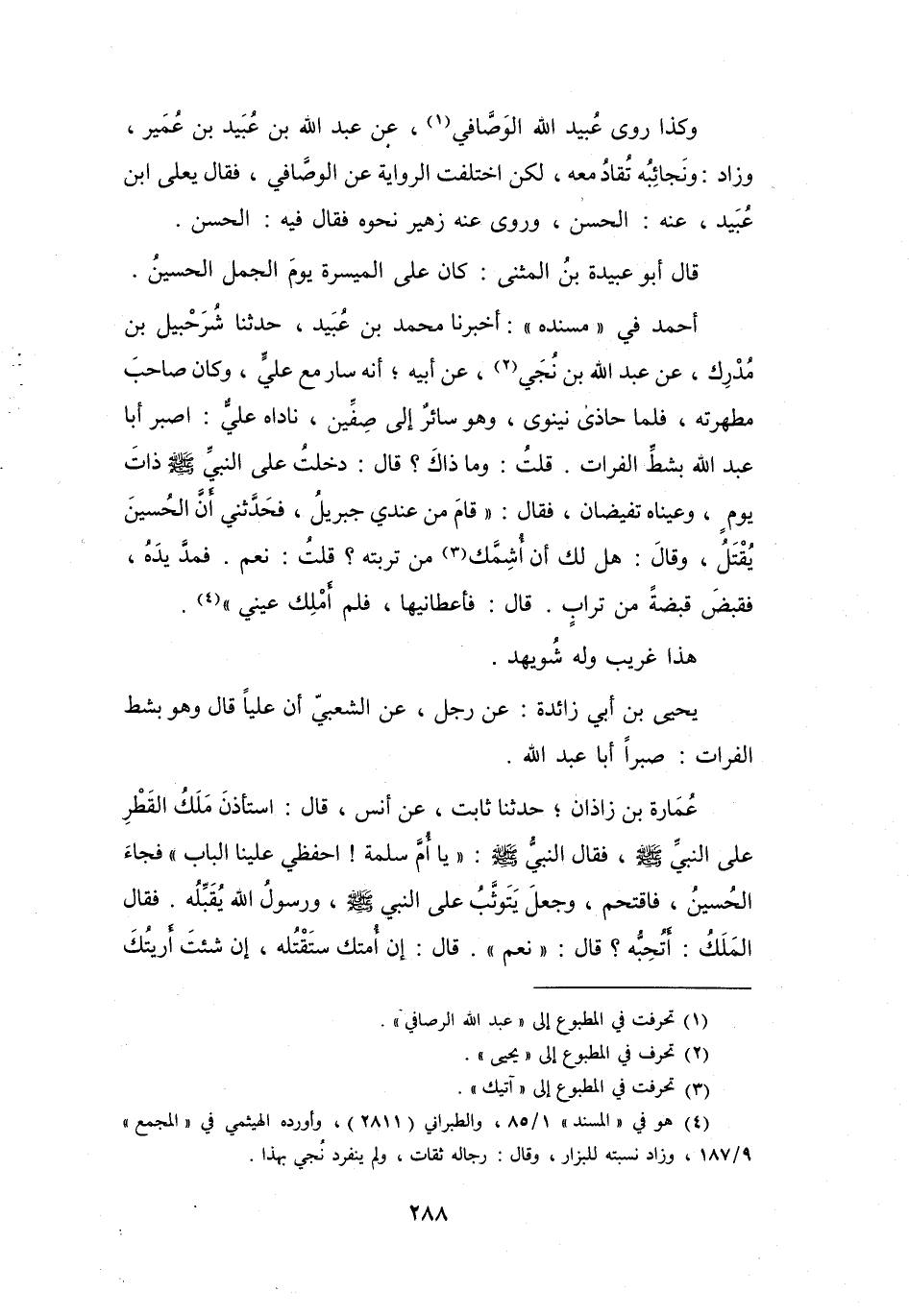قَالَ: دَخَلْتُ عَلَى النَّبِيِّ - صَلَّى اللَّهُ عَلَيْهِ وَسَلَّمَ - ذَاتَ يَوْمٍ، وَعَيْنَاهُ تَفِيضَانِ، فَقَالَ: (قَامَ مِنْ عِنْدِي جِبْرِيْلُ، فَحَدَّثَنِي أَنَّ الحُسَيْنَ يُقْتَلُ، وَقَالَ: هَلْ لَكَ أَنْ أُشِمَّكَ (3) مِنْ تُرْبتِه؟