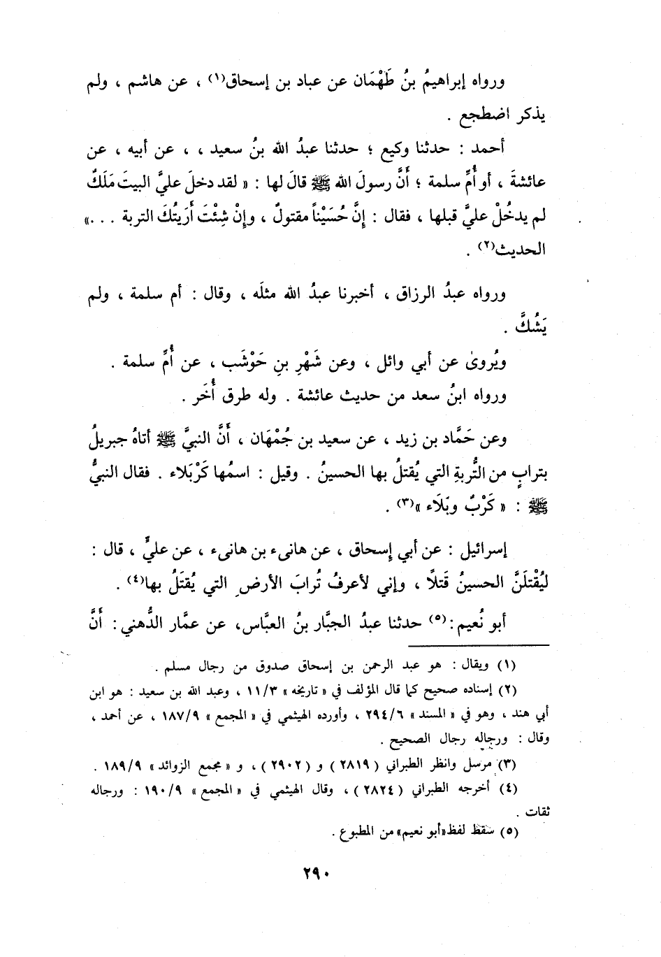 أَنَّ رَسُوْلَ اللهِ -صَلَّى اللَّهُ عَلَيْهِ وَسَلَّمَ - قَالَ لَهَا: (لَقَدْ دَخَلَ عَلَيَّ البَيْتَ مَلَكٌ لَمْ يَدْخُلْ عَلَيَّ قَبْلَهَا، فَقَالَ: إِنَّ حُسَيْناً مَقْتُوْلٌ، وَإِنْ شِئْتَ أَرَيْتُكَ التُّرْبَةَ ... ) ، الحَدِيْثَ (2) .