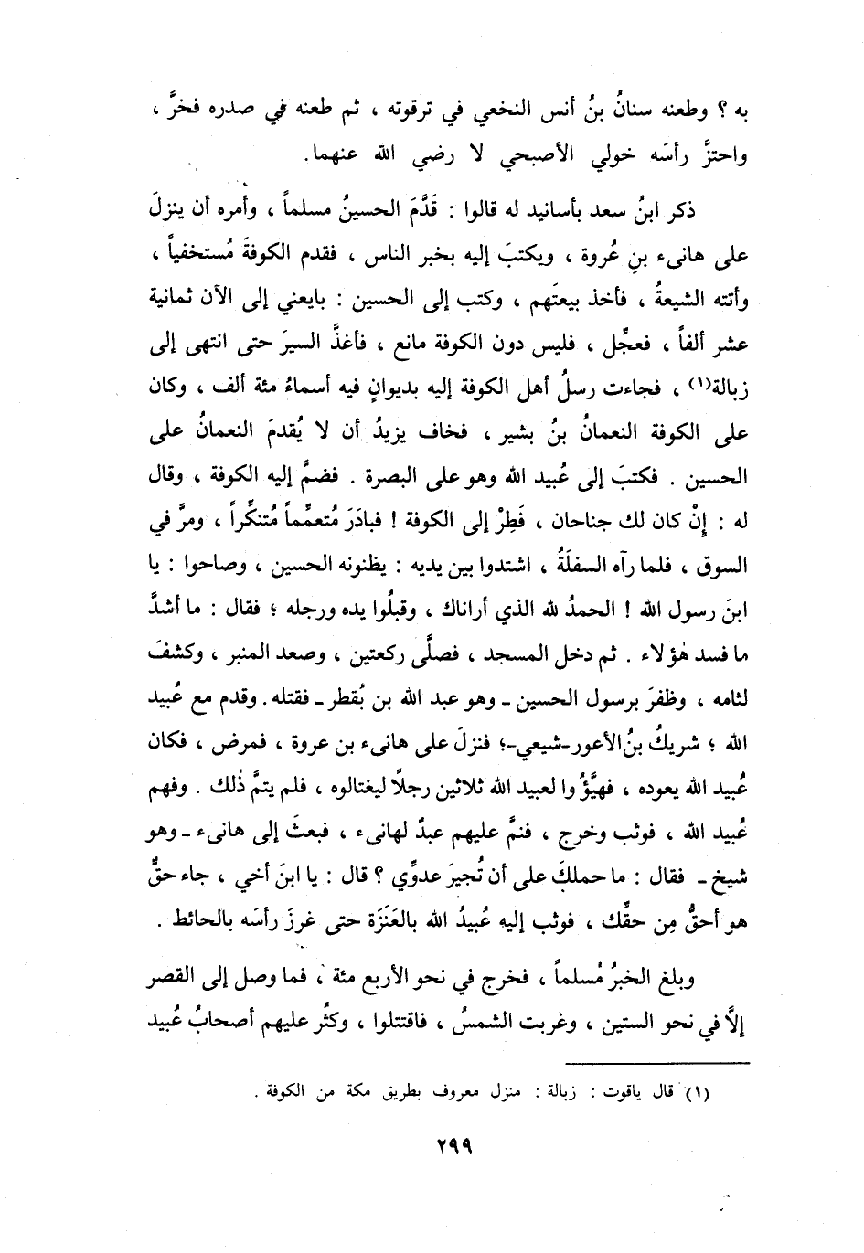 فَأَغذَّ السَّيْرَ حَتَّى انْتَهَى إِلَى زبَالَةَ (1) ، فَجَاءتْ رُسُلُ أَهْلِ الكُوْفَةِ إِلَيْهِ بِدِيوَانٍ فِيْهِ أَسْمَاءُ مائَةِ أَلْفٍ، وَكَانَ عَلَى الكُوْفَةِ النُّعْمَانُ بنُ بَشِيْرٍ، فَخَافَ يَزِيْدُ أَنْ لاَ يُقْدِمَ النُّعْمَانُ عَلَى الحُسَيْنِ.