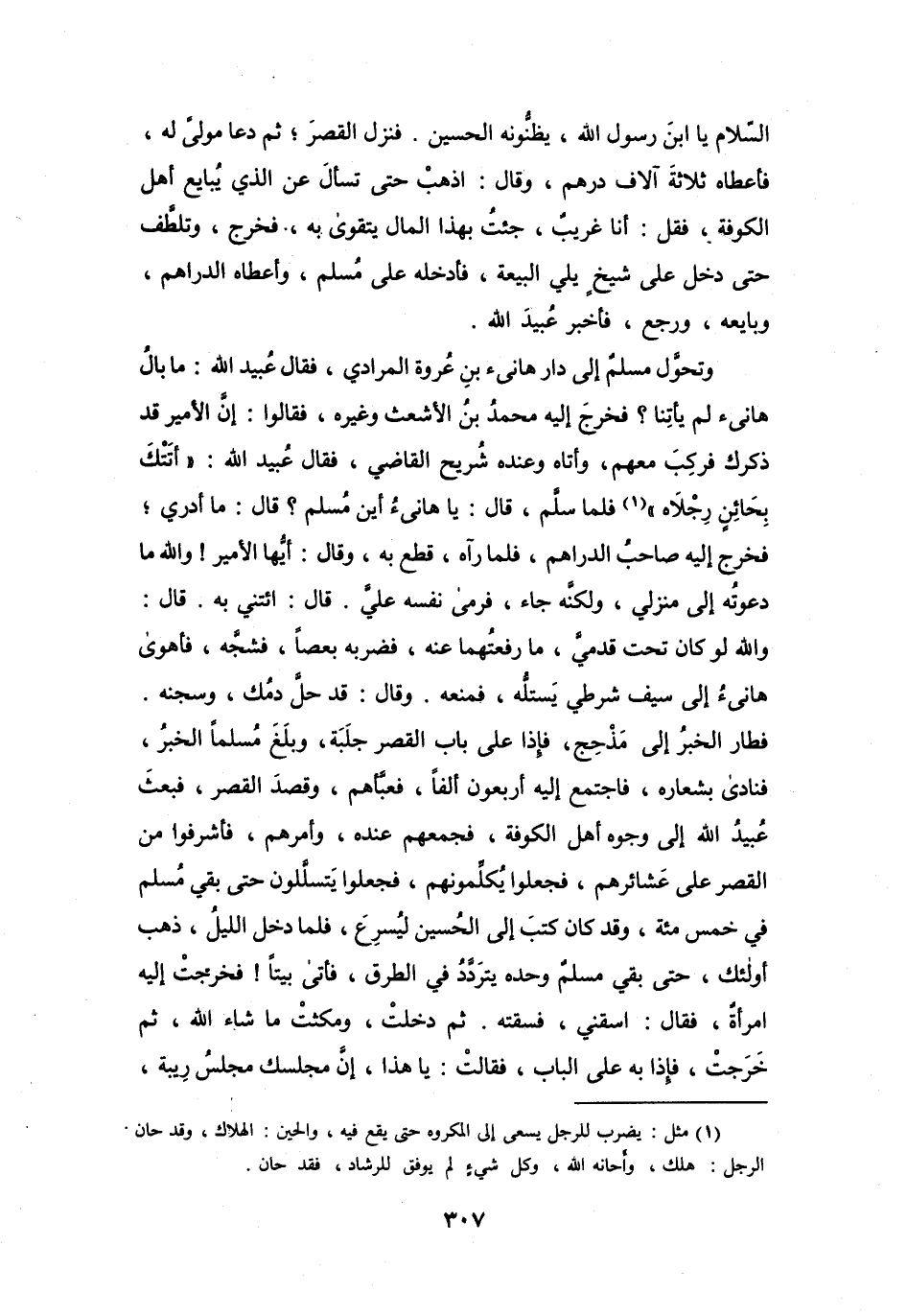 وَتَحوَّلَ مُسْلِمٌ إِلَى دَارِ هَانِئ بنِ عُرْوَةَ المُرَادِيِّ، فَقَالَ عُبَيْدُ اللهِ: مَا بَالُ هَانِئ لَمْ يَأْتِنَا؟