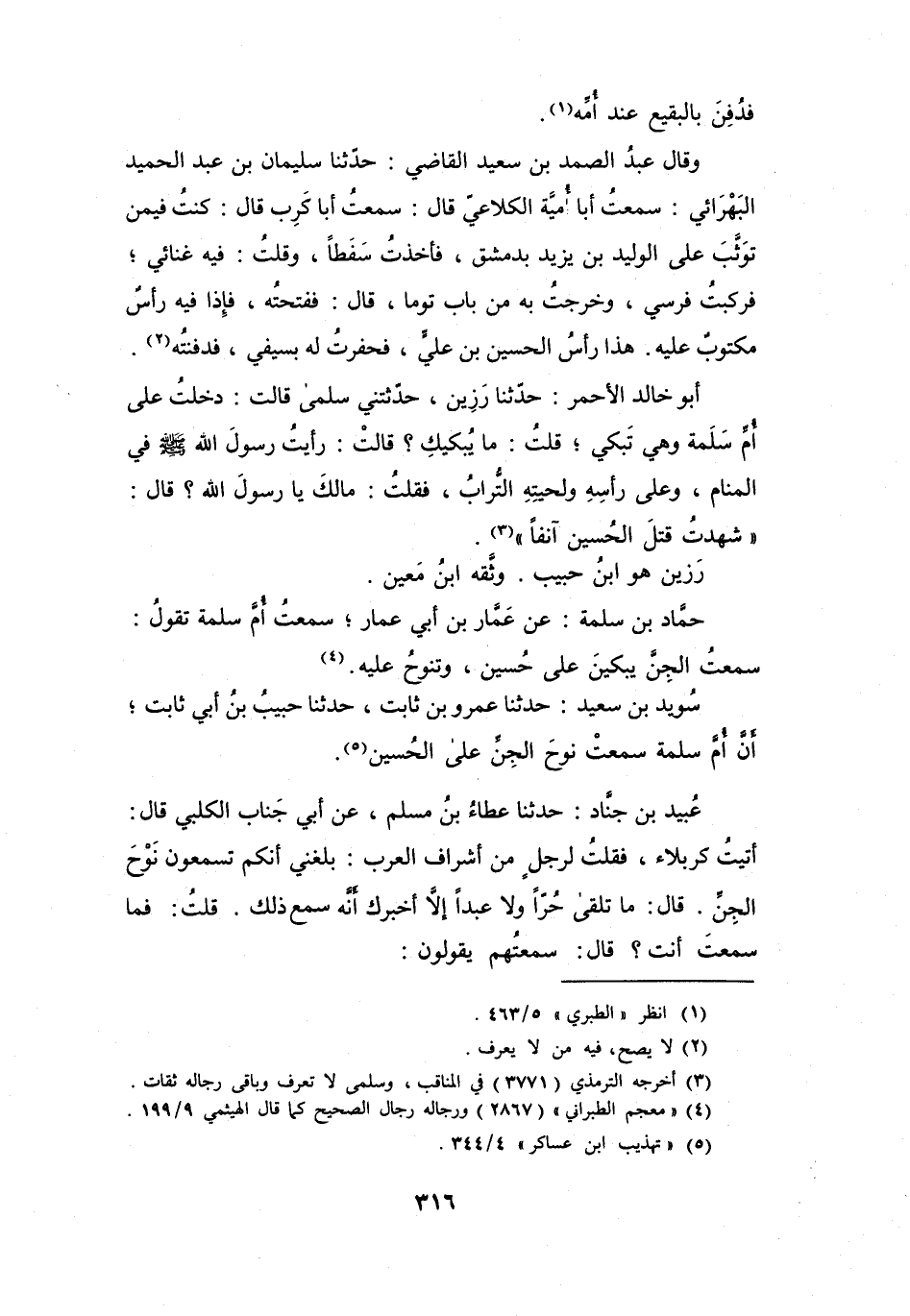 أَنَّ أُمَّ سَلَمَةَ سَمِعَتْ نَوْحَ الجِنِّ عَلَى الحُسَيْنِ (5) .