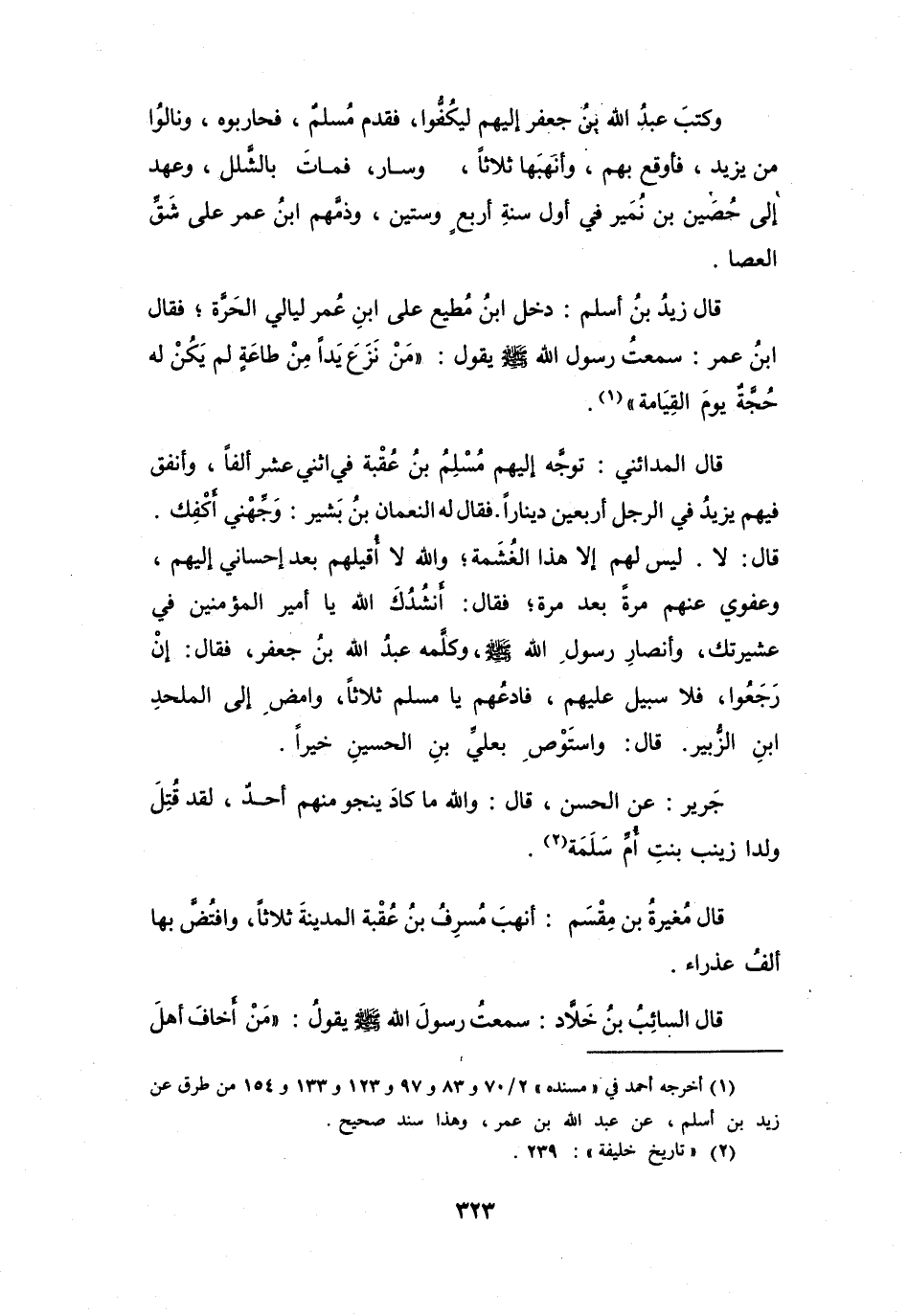وَكَتَبَ عَبْدُ اللهِ بنُ جَعْفَرٍ إِلَيْهِم لِيَكُفُّوا، فَقَدِمَ مُسْلِمٌ، فَحَارَبُوْهُ، وَنَالُوا مِنْ يَزِيْدَ، فَأَوقَعَ بِهِم، وَأَنْهَبَهَا ثَلاَثاً، وَسَارَ، فَمَاتَ بِالشَّلَلِ، وَعَهِدَ إِلَى حُصَيْنِ بنِ نُمَيْرٍ فِي أَوَّلِ سَنَةِ أَرْبَعٍ وَسِتِّيْنَ، وَذَمَّهُمُ ابْنُ عُمَرَ عَلَى شَقِّ العَصَا.