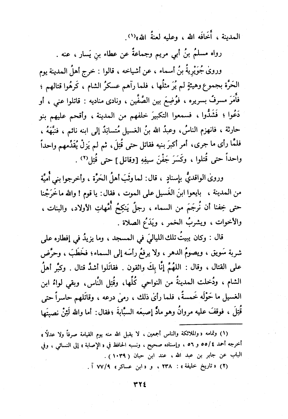 فَقَاتَلُوا أَشَدَّ قِتَالٍ، وَكَبَّرَ أَهْلُ الشَّامِ، وَدُخِلَتِ المَدِيْنَةُ مِنَ النَّوَاحِي كُلِّهَا، وَقُتِلَ النَّاسُ، وَبَقِيَ لِوَاءُ ابْنِ الغَسِيْلِ مَا حَوْلَهُ خَمْسَةٌ، فَلَمَّا رَأَى ذَلِكَ، رَمَى دِرْعَهُ، وَقَاتَلَهُم حَاسِراً حَتَّى قُتِلَ، فَوَقَفَ عَلَيْهِ مَرْوَانُ وَهُوَ مَادٌّ إِصْبَعَهُ السَّبَّابَةَ؛ فَقَالَ: أَمَا وَاللهِ، لَئِنْ نَصَبْتَهَا