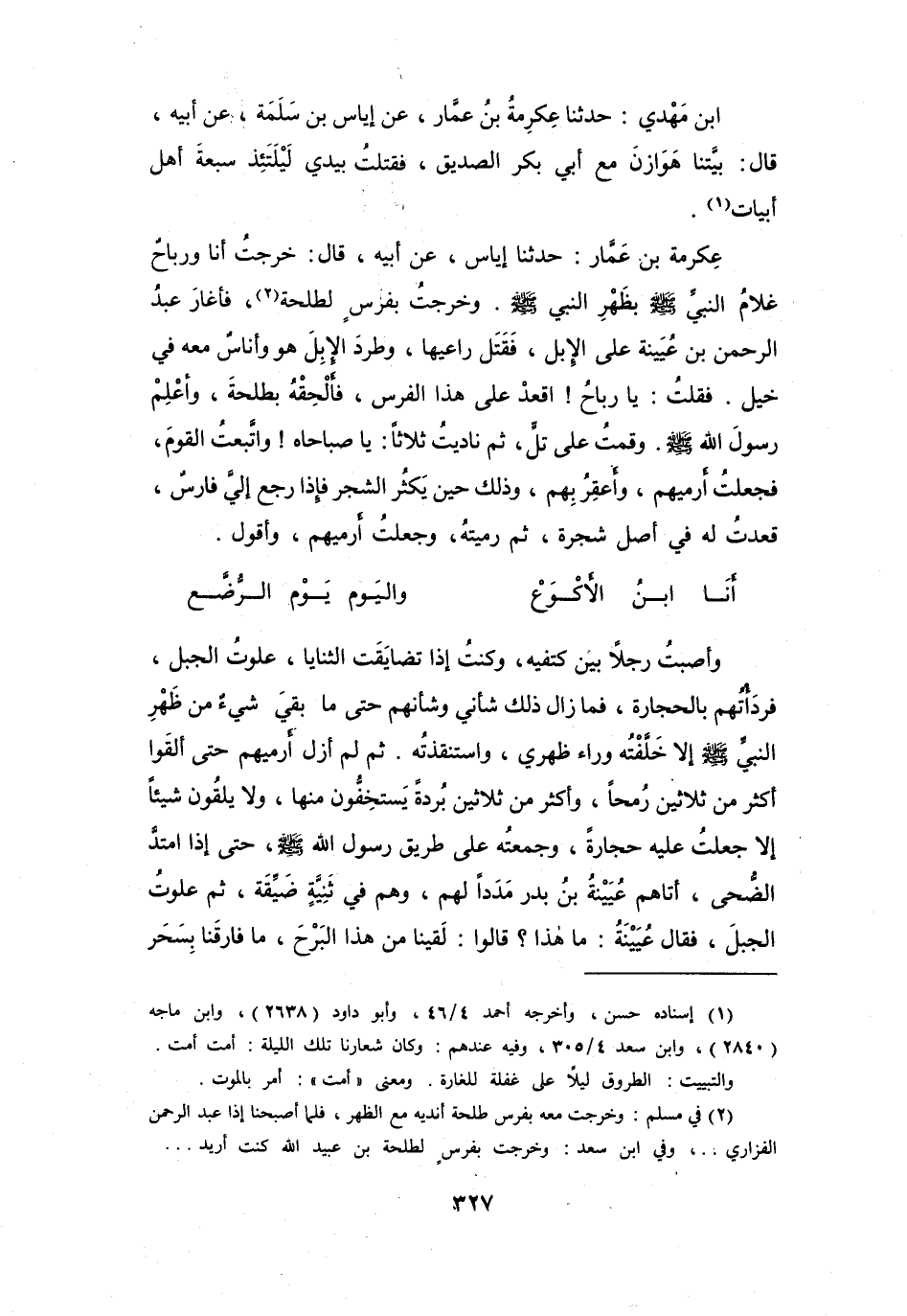 ثُمَّ لَمْ أَزَلْ أَرْمِيْهِم حَتَّى أَلْقَوْا أَكْثَرَ مِنْ ثَلاَثِيْنَ رُمْحاً، وَأَكْثَرَ مِنْ ثَلاَثِيْنَ بُرْدَةً يَسْتَخِفُّونَ مِنْهَا، وَلاَ يُلْقُوْنَ شَيْئاً إِلاَّ جَعَلْتُ عَلَيْهِ حِجَارَةً، وَجَمَعتُهُ عَلَى طَرِيقِ رَسُوْلِ اللهِ -صَلَّى اللَّهُ عَلَيْهِ وَسَلَّمَ - حَتَّى إِذَا امتَدَّ الضُّحَى، أَتَاهُم عُيَيْنَةُ بنُ بَدْرٍ مَدَداً لَهُم، وَهُم فِي ثَنِيَّةٍ ضَيِّقَةٍ، ثُمَّ عَلَوْتُ الجَبَلَ.