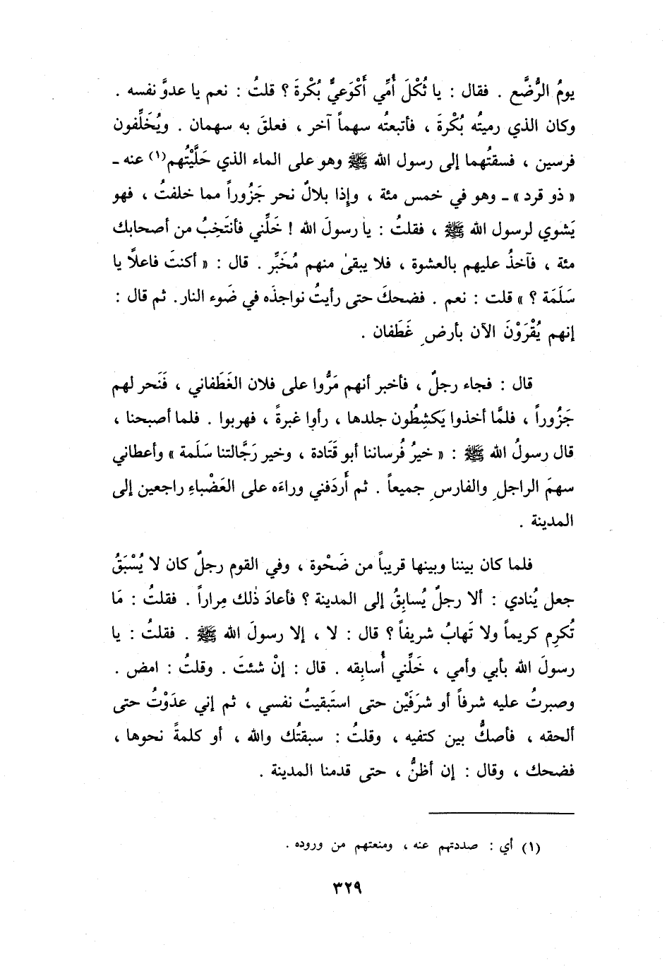 وَصَبَرْتُ عَلَيْهِ شَرفاً أَوْ شَرَفَيْنِ حَتَّى اسْتبْقَيْتُ نَفسِي، ثُمَّ إِنِّيْ عَدَوْتُ حَتَّى أَلحَقَهُ، فَأَصُكُّ بَيْنَ كَتِفَيْهِ، وَقُلْتُ: سَبَقتُكَ وَاللهِ - أَوْ كَلمَةً نَحْوَهَا -.