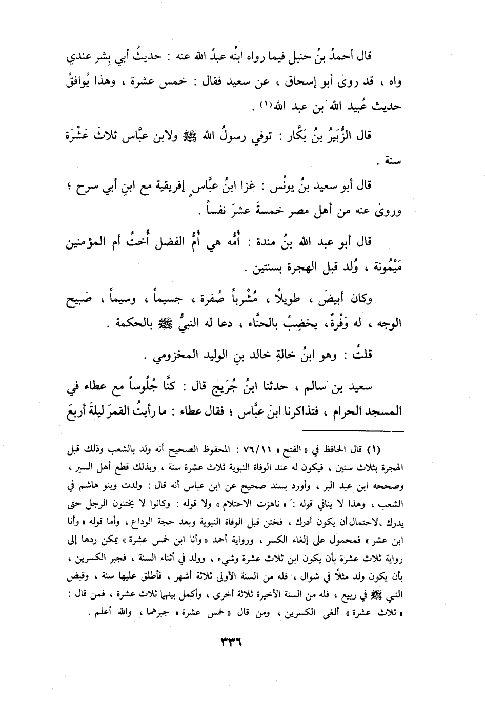 (1) قال الحافظ في " الفتح " 11 / 76: المحفوظ الصحيح أنه ولد بالشعب وذلك قبل الهجرة بثلاث سنين، فيكون له عند الوفاة النبوية ثلاث عشرة سنة، وبذلك قطع أهل السير، وصححه ابن عبد البر، وأورد بسند صحيح عن ابن عباس أنه قال: ولدت وبنو هاشم في