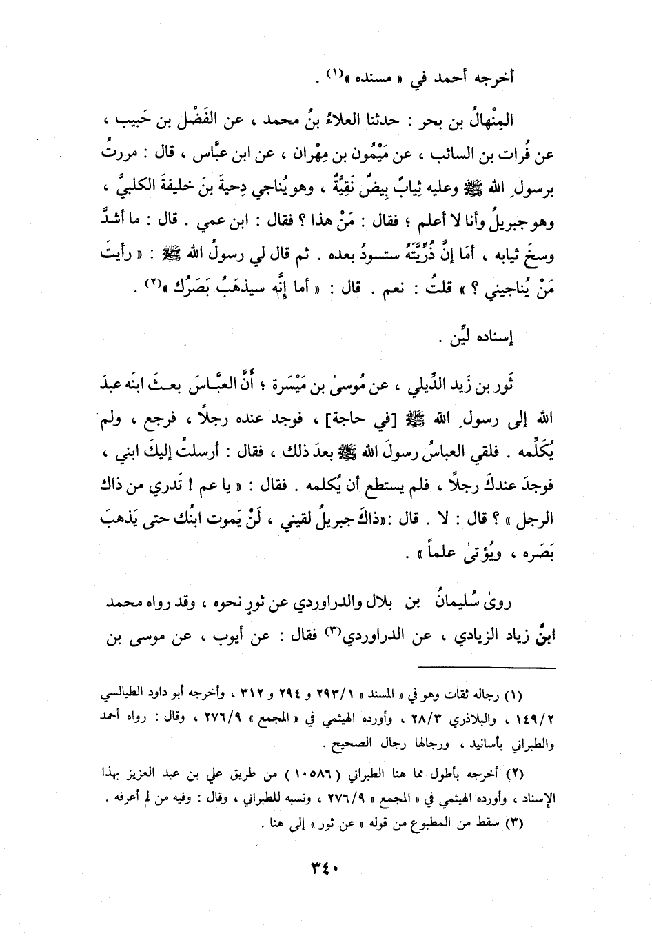مَررْتُ بِرَسُوْلِ اللهِ -صَلَّى اللَّهُ عَلَيْهِ وَسَلَّمَ - وَعَلَيْهِ ثِيَابٌ بِيضٌ نَقِيَّةٌ، وَهُوَ يُنَاجِي دِحْيَةَ بنَ خَلِيْفَةَ الكَلْبِيَّ، وَهُوَ جِبْرِيْلُ وَأَنَا لاَ أَعْلَمُ، فَقَالَ: مَنْ هَذَا؟