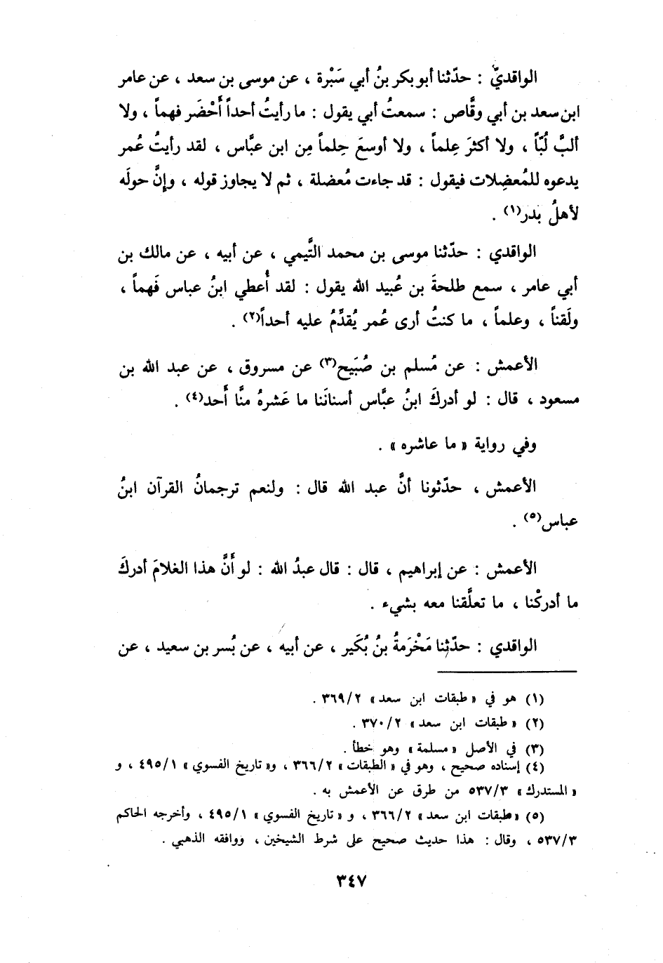 (5) " طبقات ابن سعد " 2 / 366، و" تاريخ الفسوي " 1 / 495، وأخرجه الحاكم 3 / 537، وقال: هذا حديث صحيح على شرط الشيخين، ووافقه الذهبي.