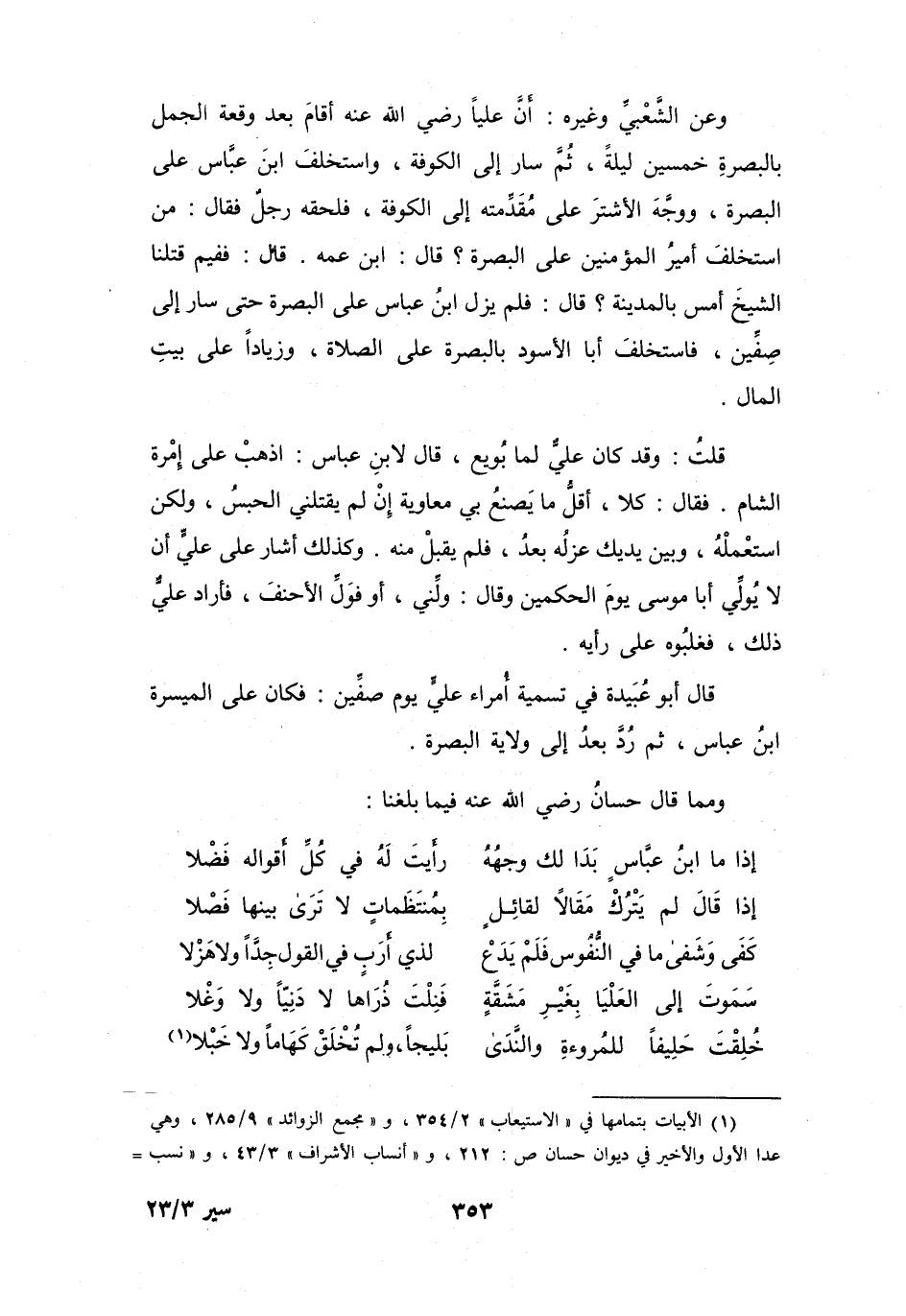 وَعَنِ الشَّعْبِيِّ، وَغَيْرِهِ: أَنَّ عَلِيّاً -رَضِيَ اللهُ عَنْهُ - أَقَامَ بَعْدَ وَقْعَةِ الجَمَلِ بِالبَصْرَةِ خَمْسِيْنَ لَيْلَةً، ثُمَّ سَارَ إِلَى الكُوْفَةِ، وَاسْتَخلَفَ ابْنَ عَبَّاسٍ عَلَى البَصْرَةِ، وَوَجَّهَ الأَشْتَرَ عَلَى مُقَدِّمَتِهُ إِلَى الكُوْفَةِ، فَلَحِقَهُ رَجُلٌ، فَقَالَ: مَنِ اسْتَخلَفَ أَمِيْرُ المُؤْمِنِيْنَ عَلَى البَصْرَةِ؟