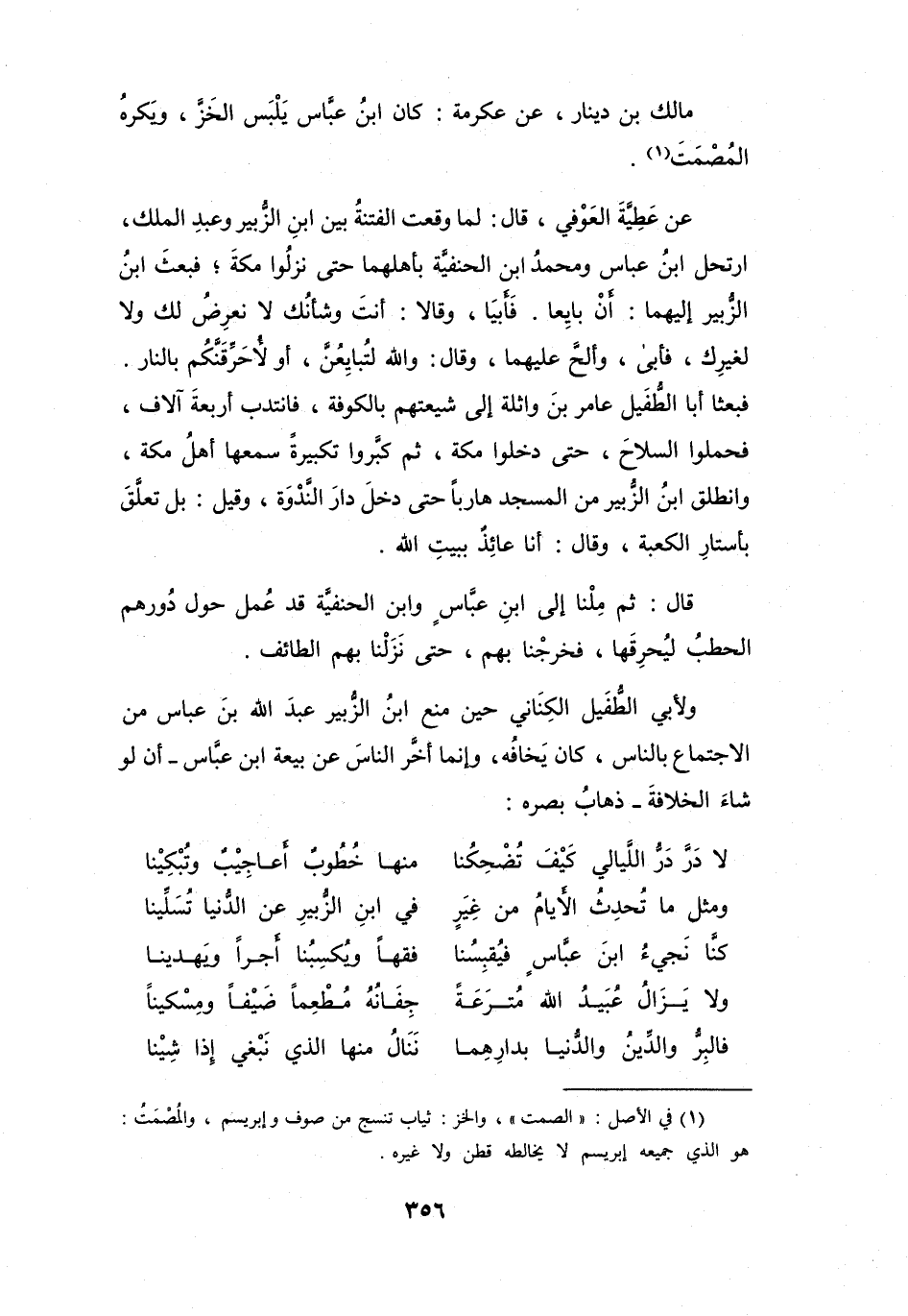 وَلأَبِي الطُّفَيْلِ الكِنَانِيِّ حِيْنَ مَنَعَ ابْنُ الزُّبَيْرِ عَبْدَ اللهِ بنَ عَبَّاسٍ مِنَ الاجتِمَاعِ بِالنَّاسِ، كَانَ يَخَافُهُ، وَإِنَّمَا أَخَّرَ النَّاسَ عَنْ بَيْعَةِ ابْنِ عَبَّاسٍ - أَنْ لَوْ شَاءَ الخِلاَفَةَ - ذَهَابُ بَصَرِهِ: