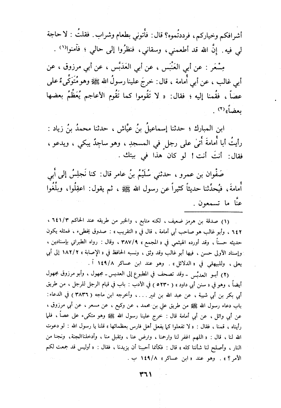 (2) أبو العدبس - وقد تصحف في المطبوع إلى العديس - مجهول، وأبو مرزوق مجهول أيضا، وهو " في سنن أبي داود " (5230) في الأدب: باب في قيام الرجل للرجل، من طريق أبي بكر بن أبي شيبة، عن عبد الله بن نمير ... ، وأخرجه ابن ماجه (3836) في الدعاء: باب دعاء رسول الله صلى الله عليه وسلم من طريق علي بن محمد، عن وكيع، عن مسعر، عن أبي مرزوق، عن أبي وائل، عن أبي أمامة قال: خرج علينا رسول الله صلى الله عليه وسلم وهو متكئ على عصا، فلما رأيناه، قمنا، فقال: " لا تفعلوا كما يفعل أهل فارس بعظمائها " قلنا يا رسول الله: لو دعوت الله لنا، قال: " اللهم اغفر لنا وارحمنا، وارض عنا، وتقبل منا، وأدخلنا الجنة، ونجنا من النار، وأصلح لنا شأننا كله " قال: فكأنما أحببنا أن يزيدنا، فقال: " أو ليس قد جمعت لكم الامر؟ ".