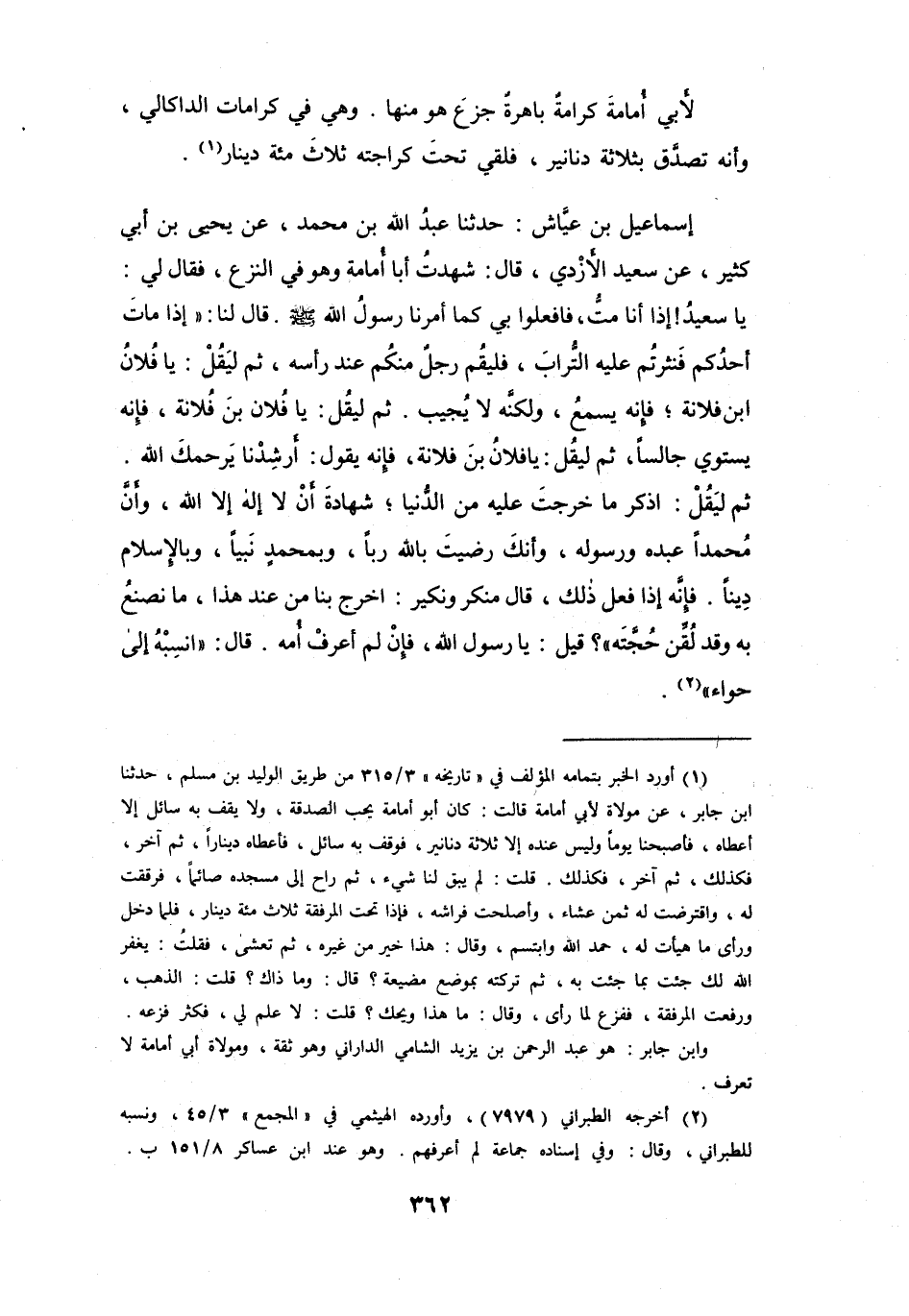 شَهِدْتُ أَبَا أُمَامَةَ وَهُوَ فِي النَّزْعِ، فَقَالَ لِي: يَا سَعِيْدُ! إِذَا أَنَا مِتُّ، فَافْعَلُوا بِي كَمَا أَمَرَنَا رَسُوْلُ اللهِ -صَلَّى اللَّهُ عَلَيْهِ وَسَلَّمَ - قَالَ لَنَا: (إِذَا مَاتَ أَحَدُكُمْ، فَنَثَرْتُمْ عَلَيْهِ التُّرَابَ، فَلْيَقُمْ رَجُلٌ مِنْكُمْ عِنْدَ رَأْسِهِ، ثُمَّ لْيَقُلْ: يَا فُلاَنُ بنُ فُلاَنَةَ؛ فَإِنَّهُ يَسْمَعُ، وَلَكِنَّهُ لاَ يُجِيْبُ، ثُمَّ لْيَقُلْ: يَا فُلاَنُ بنُ فُلاَنَةَ، فَإِنَّهُ يَسْتَوِي جَالِساً، ثُمَّ لْيَقُلْ: يَا فُلاَنُ بنُ فُلاَنَةَ، فَإِنَّهُ يَقُوْلُ: أَرْشِدْنَا يَرْحَمْكَ اللهُ، ثُمَّ لْيَقُلْ: اذكُرْ مَا خَرَجْتَ عَلَيْهِ مِنَ الدُّنْيَا؛ شَهَادَةَ أَنْ لاَ إِلَهَ إِلاَّ اللهَ، وَأَنَّ مُحَمَّداً عَبْدُهُ وَرَسُوْلُهُ، وَأَنَّكَ رَضِيْتَ بِاللهِ رَبّاً، وَبِمُحَمَّدٍ نَبِيّاً، وَبَالإِسْلاَمِ دِيْناً، فَإِنَّهُ إِذَا فَعَلَ ذَلِكَ، قَالَ مُنْكَرٌ وَنَكِيْرٌ: اخْرُجْ بِنَا مِنْ عِنْدِ هَذَا، مَا نَصْنَعُ بِهِ وَقَدْ لُقِّنَ حُجَّتَهُ؟!) .