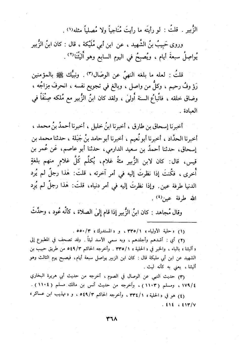 كَانَ ابْنُ الزُّبَيْرِ يُوَاصِلُ سَبْعَةَ أَيَّامٍ، وَيُصْبِحُ فِي اليَوْمِ السَّابِعِ وَهُوَ أَلْيَثُنَا (2) .