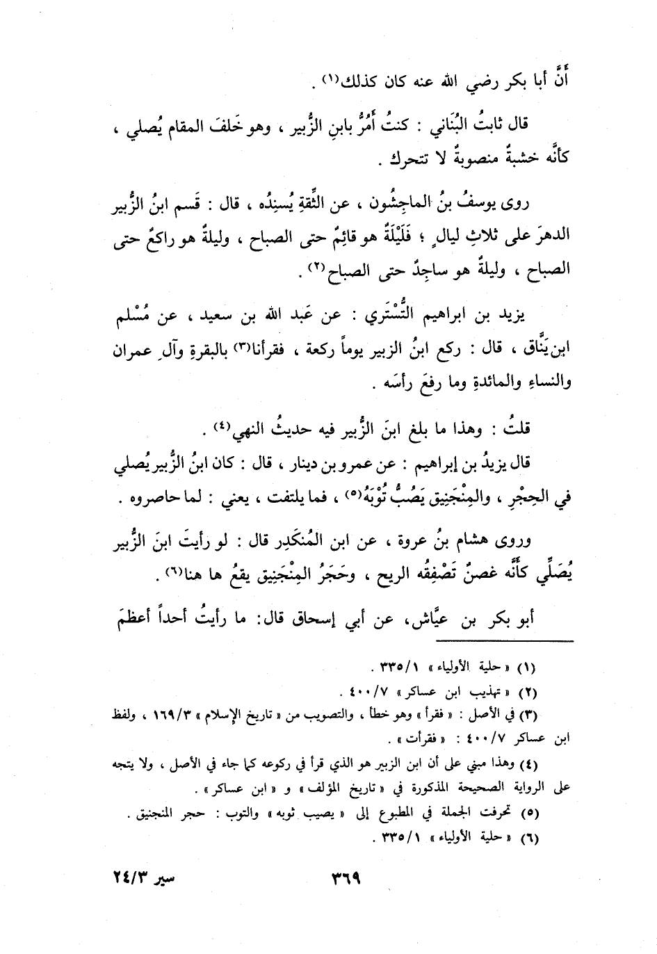 (4) وهذا مبني على أن ابن الزبير هو الذي قرأ في ركوعه كما جاء في الأصل، ولا يتجه على الرواية الصحيحة المذكورة في " تاريخ المؤلف " و" ابن عساكر ".