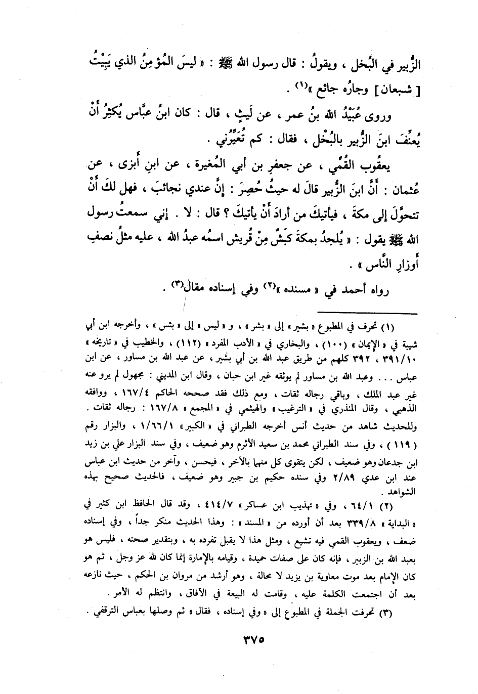 (2) 1 / 64، وفي " تهذيب ابن عساكر " 7 / 414، وقد قال الحافظ ابن كثير في " البداية " 8 / 339 بعد أن أورده من " المسند ": وهذا الحديث منكر جدا، وفي إسناده ضعف، ويعقوب القمي فيه تشيع، ومثل هذا لا يقبل تفرده به، وبتقدير صحته، فليس هو بعبد الله بن الزبير، فإنه كان على صفات حميدة، وقيامه بالامارة إنما كان لله عزوجل، ثم هو كان الامام بعد موت معاوية بن يزيد لا محالة، وهو أرشد من مروان بن الحكم، حيث نازعه بعد أن اجتمعت الكلمة عليه، وقامت له البيعة في الآفاق، وانتظم له الامر.
