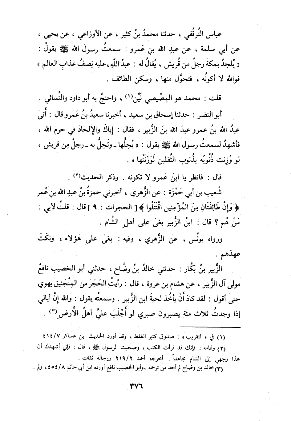 أَتَى عَبْدُ اللهِ بنُ عَمْرٍو عَبْدَ اللهِ بنَ الزُّبَيْرِ، فَقَالَ: إِيَّاكَ وَالإِلْحَادَ فِي حَرَمِ اللهِ، فَأَشْهَدُ لَسَمِعْتُ رَسُوْلَ اللهِ -صَلَّى اللَّهُ عَلَيْهِ وَسَلَّمَ - يَقُوْلُ: (يُحِلُّهَا - وَتَحِلُّ بِهِ - رَجُلٌ مِنْ قُرَيْشٍ، لَوْ وُزِنَتْ ذُنُوْبُهُ بِذُنُوْبِ الثَّقَلَيْنِ، لَوَزَنَتْهَا) .