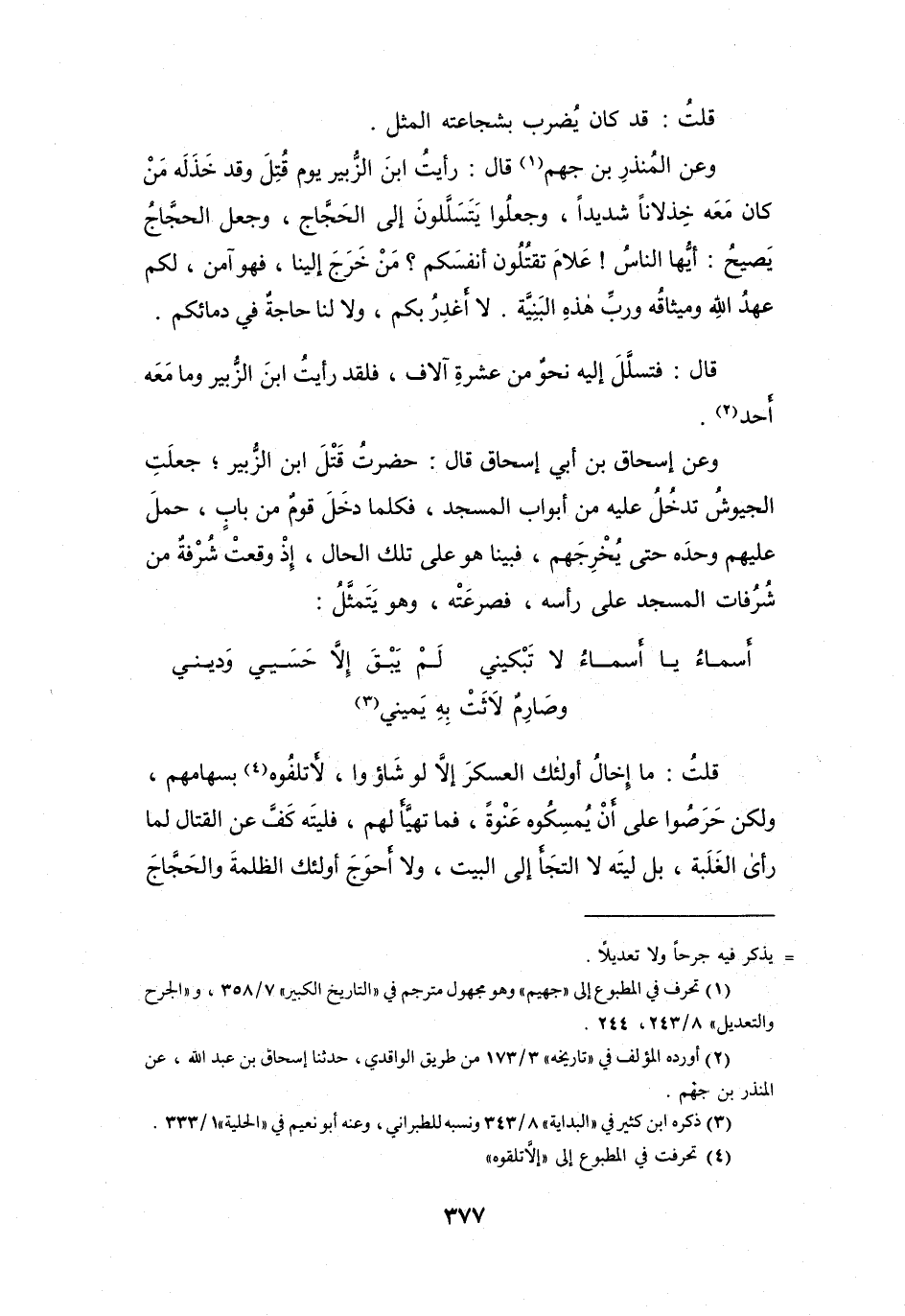 وَعَنِ المُنْذِرِ بنِ جَهْمٍ (1) ، قَالَ: رَأَيتُ ابْنَ الزُّبَيْرِ يَوْمَ قُتِلَ وَقَدْ خَذَلَهُ مَنْ كَانَ مَعَهُ خِذْلاَناً شَدِيداً، وَجَعَلُوا يَتَسَلَّلُوْنَ إِلَى الحَجَّاجِ، وَجَعَلَ الحَجَّاجُ يَصِيحُ: أَيُّهَا النَّاسُ! عَلاَمَ تَقْتُلُوْنَ أَنْفُسَكُم؟ مَنْ خَرَجَ إِلَيْنَا فَهُوَ آمِنٌ، لَكُم عَهْدُ اللهِ وَمِيْثَاقُهُ - وَرَبِّ هَذِهِ البَنِيَّةِ - لاَ أَغْدِرُ بِكُم، وَلاَ لَنَا حَاجَةٌ فِي دِمَائِكُم.