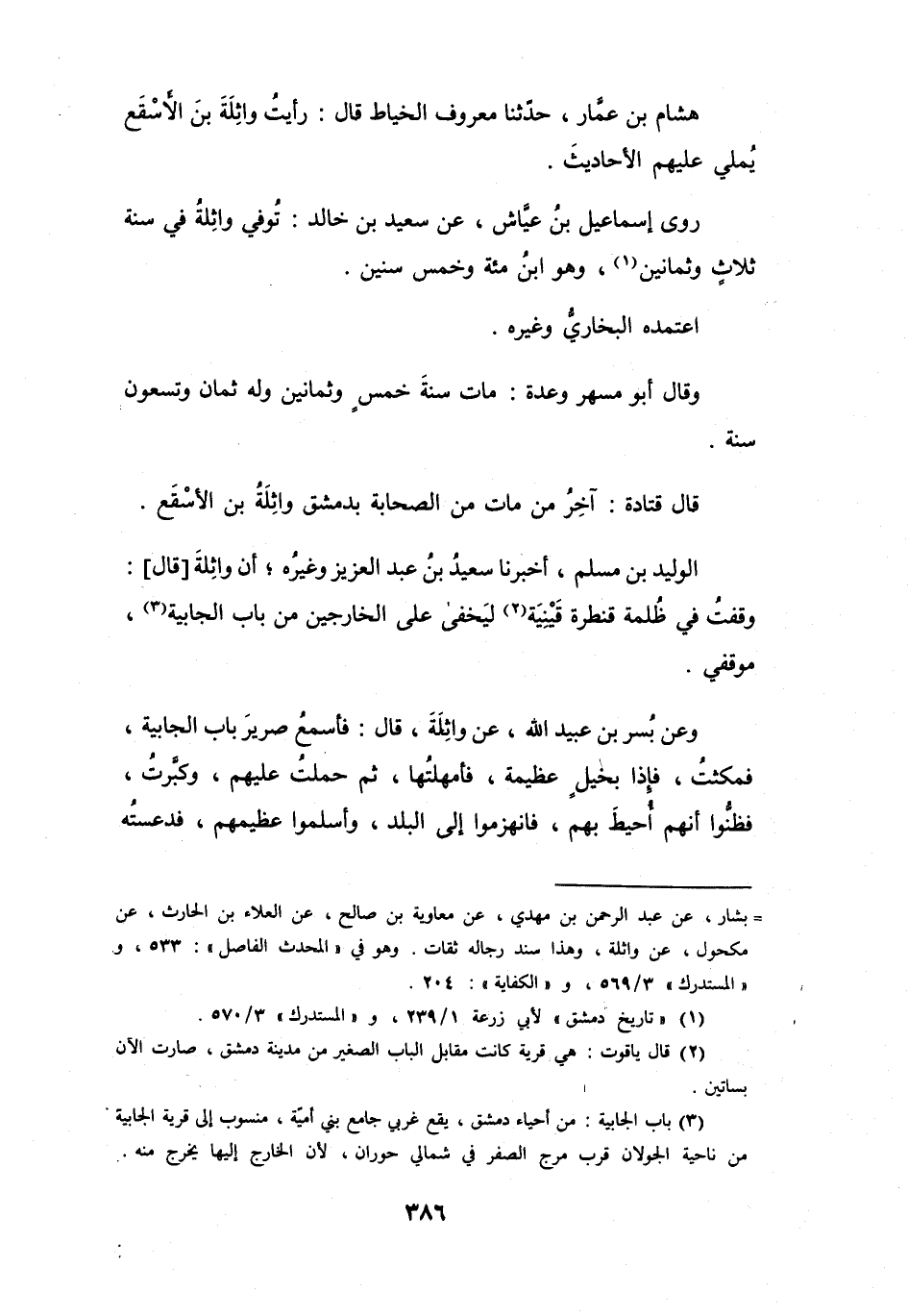 أَنَّ وَاثِلَةَ قَالَ: وَقَفتُ فِي ظُلْمَةِ قَنْطَرَةِ قَيْنِيَةَ (2) ، لِيَخْفَى عَلَى الخَارِجِيْنَ مِنْ بَابِ الجَابِيَةِ (3) مَوْقِفِي.