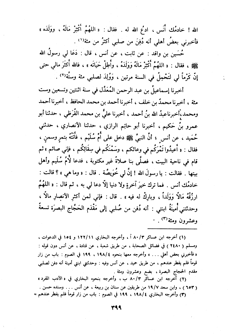 (1) أخرجه ابن عساكر 3 / 80 آ، وأخرجه البخاري 11 / 122 و154 في الدعوات، ومسلم (2480) في فضائل الصحابة، من طريق شعبة، عن قتادة، عن أنس دون قوله: " فأخبرني بعض أهلي ... " وأخرجه معها بنحوه 4 / 198، 199 في الصوم: باب من زار قوما فلم يفطر عندهم، من طريق حميد، عن أنس وفيه: وحدثتني ابنتي أمينة أنه دفن لصلبي مقدم الحجاج البصرة، بضع وعشرون ومئة.