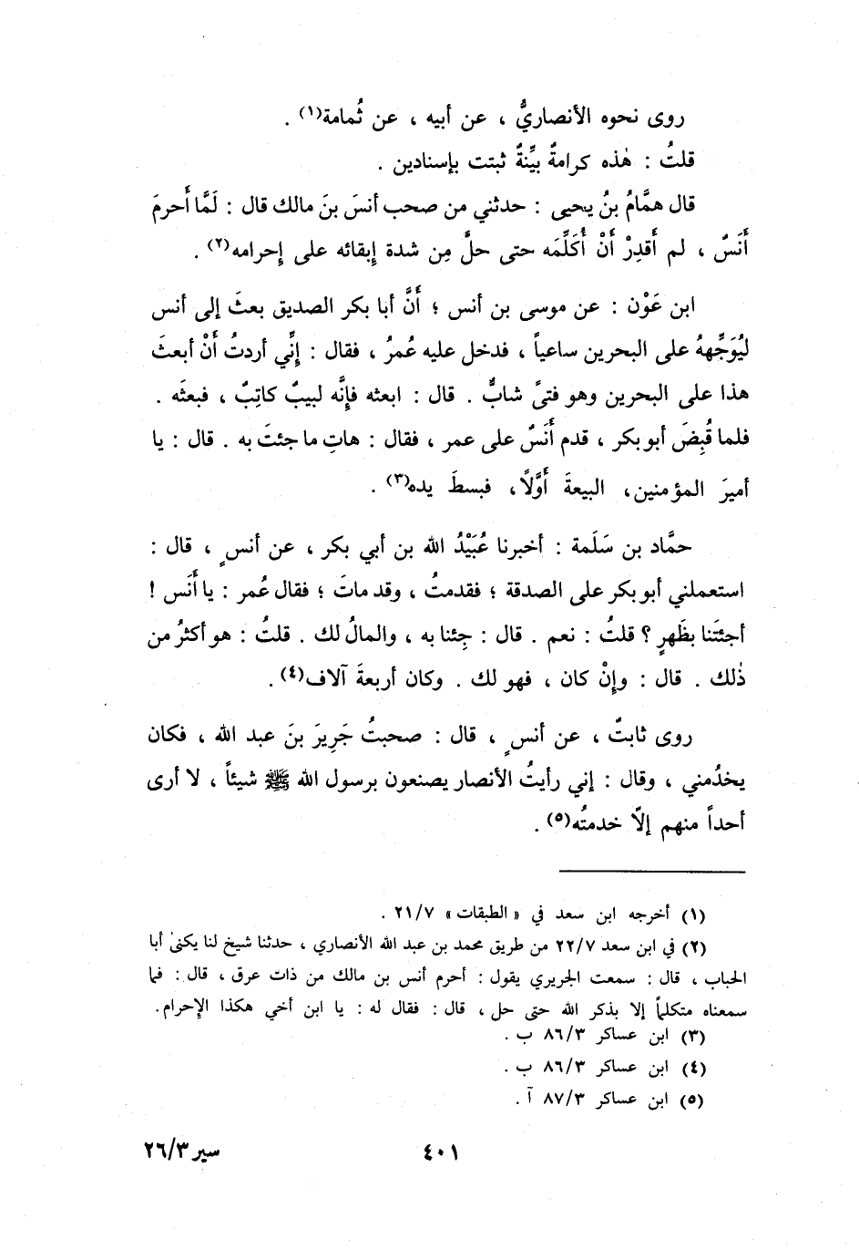 (2) في ابن سعد 7 / 22 من طريق محمد بن عبد الله الأنصاري، حدثنا شيخ لنا يكنى أبا الحباب، قال: سمعت الجريري يقول: أحرم أنس بن مالك من ذات عرق، قال: فما سمعناه متكلما إلا بذكر الله حتى حل، قال: فقال له: يا ابن أخي هكذا الاحرام.