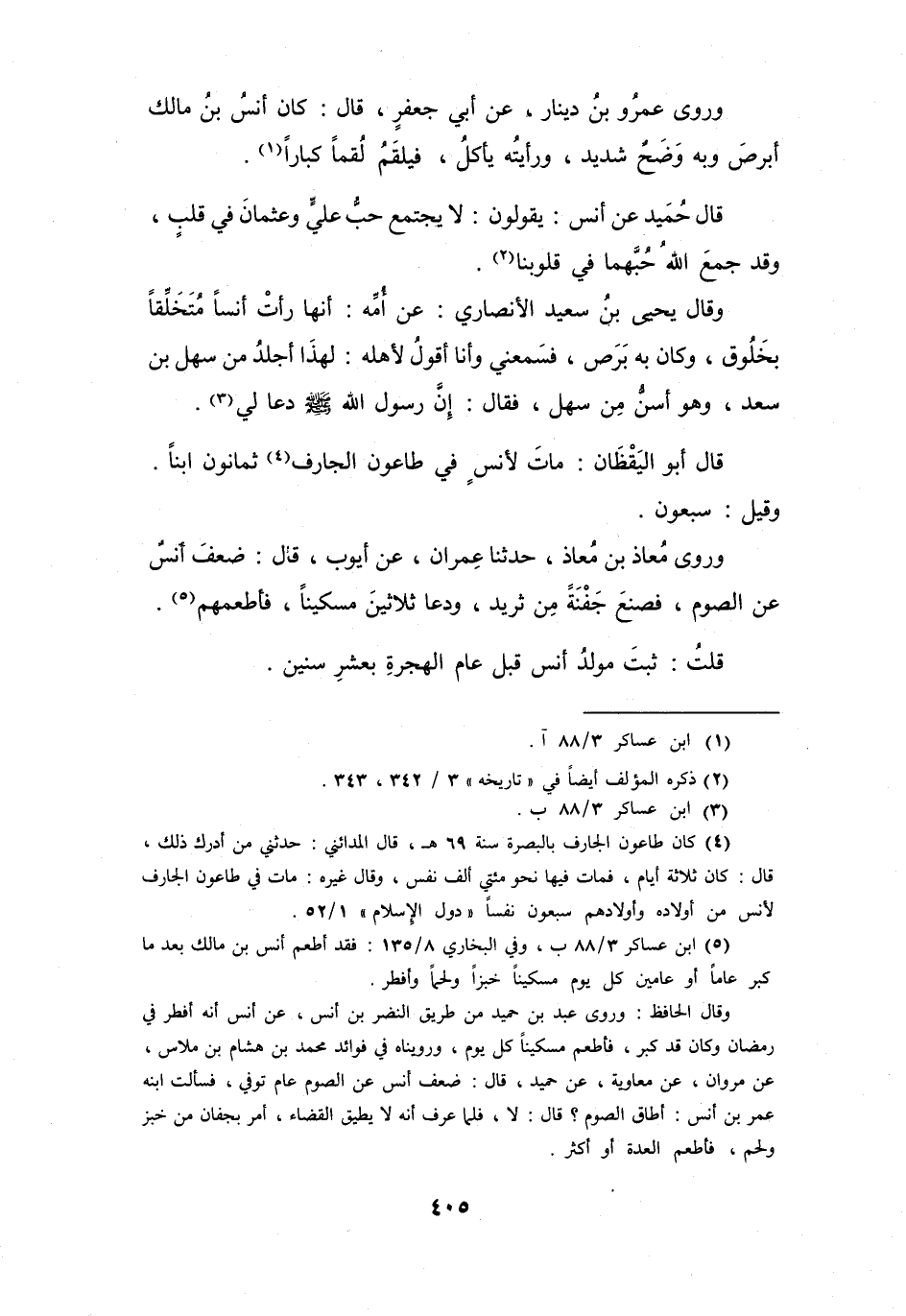 (5) ابن عساكر 3 / 88 ب، وفي البخاري 8 / 135: فقد أطعم أنس بن مالك بعد ما كبر عاما أو عامين كل يوم مسكينا خبزا ولحما وأفطر.