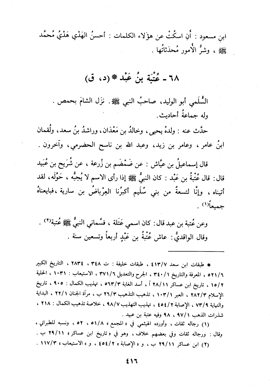 (*) طبقات ابن سعد 7 / 413، طبقات خليفة: ت 348، 2834، التاريخ الكبير 6 / 521، المعرفة والتاريخ 1 / 340، الجرح والتعديل 6 / 371، الاستيعاب: 1031، الحلية 2 / 15، تاريخ ابن عساكر 11 / 28 آ، أسد الغابة 3 / 563، تهذيب الكمال: 905، تاريخ الإسلام 3 / 282، العبر 1 / 103، تذهيب التهذيب 3 / 26 ب، مرآة الجنان 1 / 22، البداية والنهاية 9 / 73، الإصابة 2 / 454، تهذيب التهذيب 7 / 98، خلاصة تذهيب الكمال: 218، شذرات الذهب 1 / 97، 98 وفيه عتبة بن عبيد.