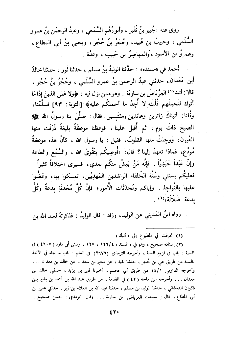 أَحْمَدُ فِي (مُسْنَدِهِ) : حَدَّثَنَا الوَلِيْدُ بنُ مُسْلِمٍ، حَدَّثَنَا ثَوْرٌ، حَدَّثَنَا خَالِدُ بنُ مَعْدَانَ، حَدَّثَنِي عَبْدُ الرَّحْمَنِ بنُ عَمْرٍو السُّلَمِيُّ، وَحُجْرُ بنُ حُجْرٍ، قَالاَ: