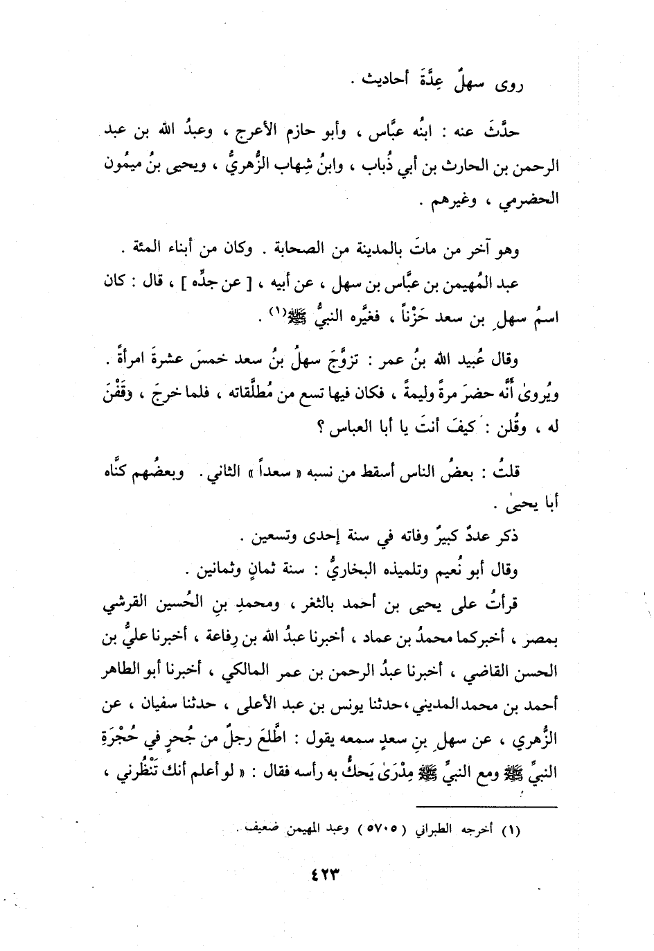 كَانَ اسْمُ سَهْلِ بنِ سَعْدٍ حَزْناً، فَغَيَّرَهُ النَّبِيُّ (1) -صَلَّى اللَّهُ عَلَيْهِ وَسَلَّمَ -.