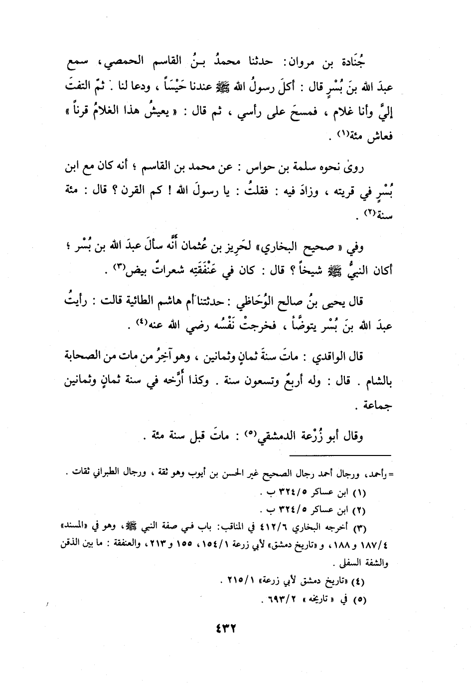 وَفِي (صَحِيْحِ البُخَارِيِّ) : لِحَرِيْزِ بنِ عُثْمَانَ، أَنَّهُ سَأَلَ عَبْدَ اللهِ بنَ بُسْرٍ: أَكَانَ النَّبِيُّ شَيْخاً؟