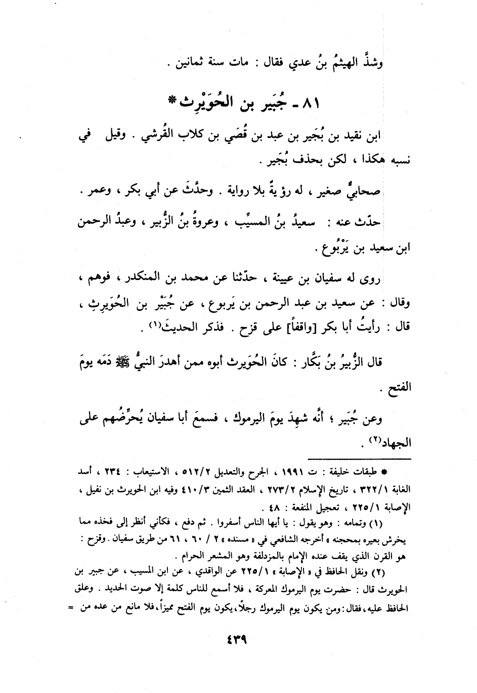 81 - جُبَيْرُ بنُ الحُوَيْرِثِ بنِ نَقِيْدِ بنِ بُجَيْرِ بنِ عَبْدِ بنِ قُصَيِّ بنِ كِلاَبٍ القُرَشِيُّ *