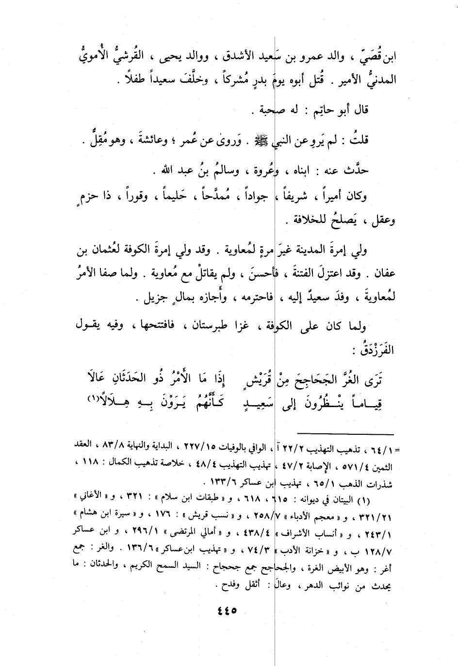 بنِ قُصَيٍّ، وَالِدُ عَمْرِو بنِ سَعِيْدٍ الأَشْدَقِ، وَوَالِدُ يَحْيَى، القُرَشِيُّ، الأُمَوِيُّ، المَدَنِيُّ، الأَمِيْرُ.
