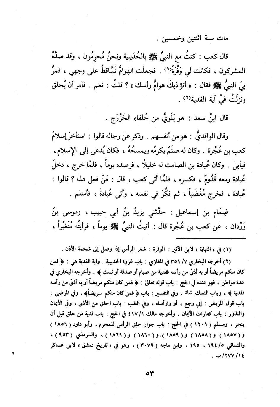 قَالَ كَعْبٌ: كُنْتُ مَعَ النَّبِيِّ -صَلَّى اللَّهُ عَلَيْهِ وَسَلَّمَ - بِالحُدَيْبِيَةِ وَنَحْنُ مُحْرِمُوْنَ، وَقَدْ صَدَّهُ المُشْرِكُوْنَ، فَكَانَتْ لِي وَفْرَةٌ (1) ، فَجَعَلَتِ الهَوَامُّ تَسَّاقَطُ عَلَى وَجْهِي.