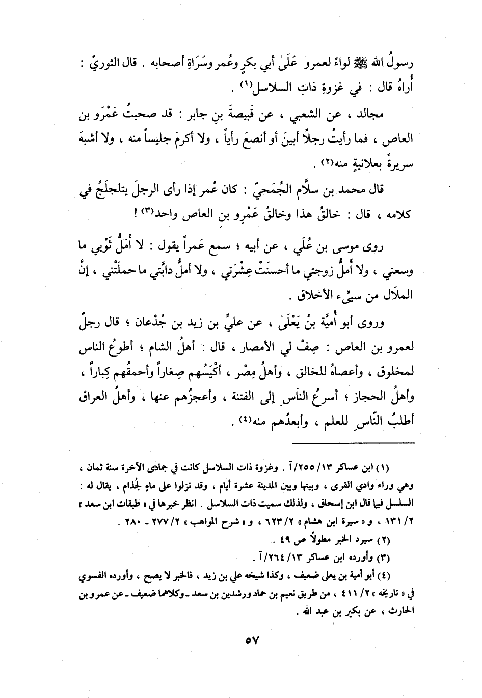 قَدْ صَحِبْتُ عَمْرَو بنَ العَاصِ، فَمَا رَأَيْتُ رَجُلاً أَبْيَنَ، أَوْ أَنْصَعَ رَأْياً، وَلاَ أَكْرَمَ جَلِيْساً مِنْهُ، وَلاَ أَشْبَهَ سَرِيْرَةً بِعَلاَنِيَةٍ مِنْهُ (2) .