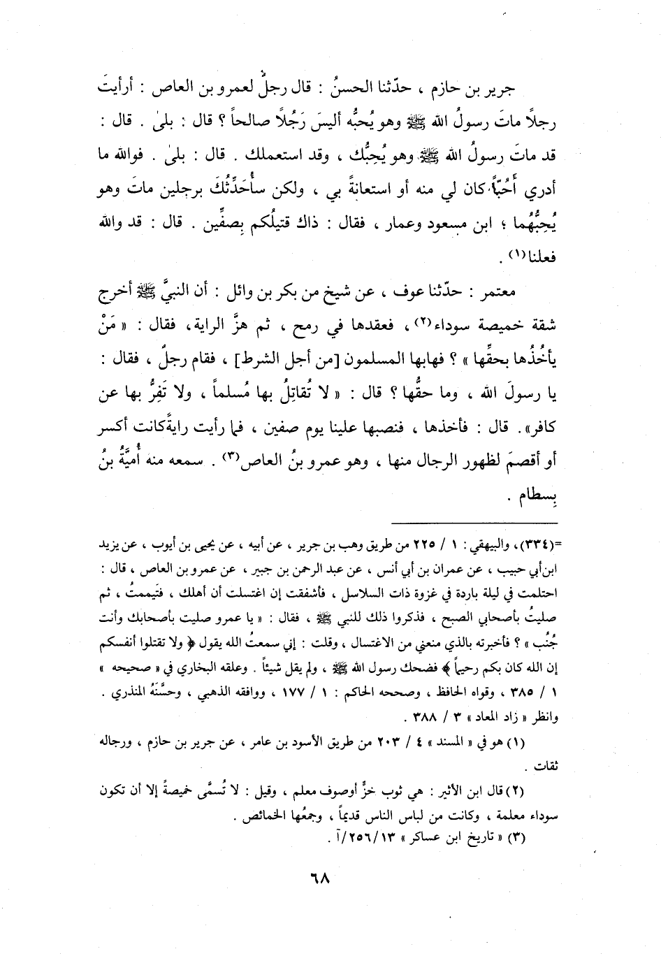 = (334) ، والبيهقي: 1 / 225 من طريق وهب بن جرير، عن أبيه، عن يحيى بن أيوب، عن يزيد ابن أبي حبيب، عن عمران بن أبي أنس، عن عبد الرحمن بن جبير، عن عمرو بن العاص، قال: احتلمت في ليلة باردة في غزوة ذات السلاسل، فأشفقت إن اغتسلت أن أهلك، فتيممت، ثم صليت بأصحابي الصبح، فذكروا ذلك للنبي صلى الله عليه وسلم، فقال: " يا عمرو صليت بأصحابك وأنت جنب "؟ فأخبرته بالذي منعني من الاغتسال، وقلت: إني سمعت الله يقول (ولا تقتلوا أنفسكم إن الله كان بكم رحيما) فضحك رسول الله صلى الله عليه وسلم، ولم يقل شيئا.