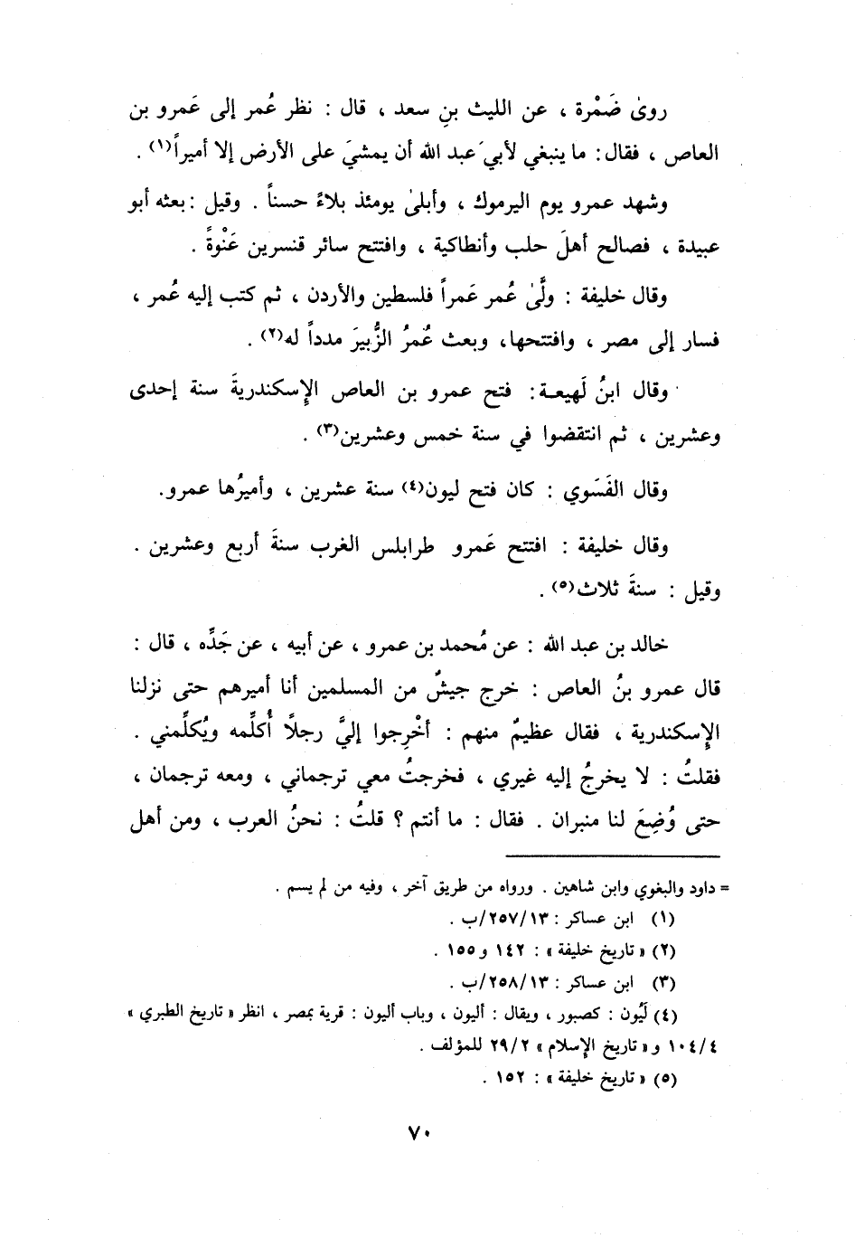 وَقَالَ خَلِيْفَةُ: وَلَّى عُمَرُ عَمْراً فِلَسْطِيْنَ وَالأُرْدُنَّ، ثُمَّ كَتَبَ إِلَيْهِ عُمَرُ، فَسَارَ إِلَى مِصْرَ، وَافْتَتَحَهَا، وَبَعَثَ عُمَرُ الزُّبَيْرَ مَدَداً لَهُ (2) .