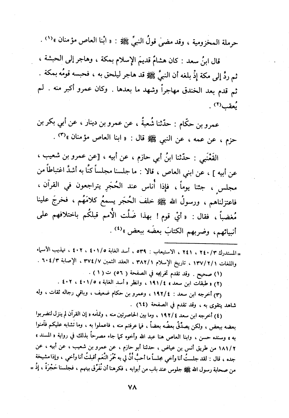 (4) أخرجه ابن سعد 4 / 192، وما بين الحاصرتين منه، وتمامه " إن القرآن لم ينزل لتضربوا بعضه ببعض، ولكن يصدق بعضه بعضا، فما عرفتم منه، فاعملوا به، وما تشابه عليكم فآمنوا به " وسنده حسن، وابنا العاص هنا عبد الله وأخوه كما جاء مصرحا بذلك في رواية " المسند "