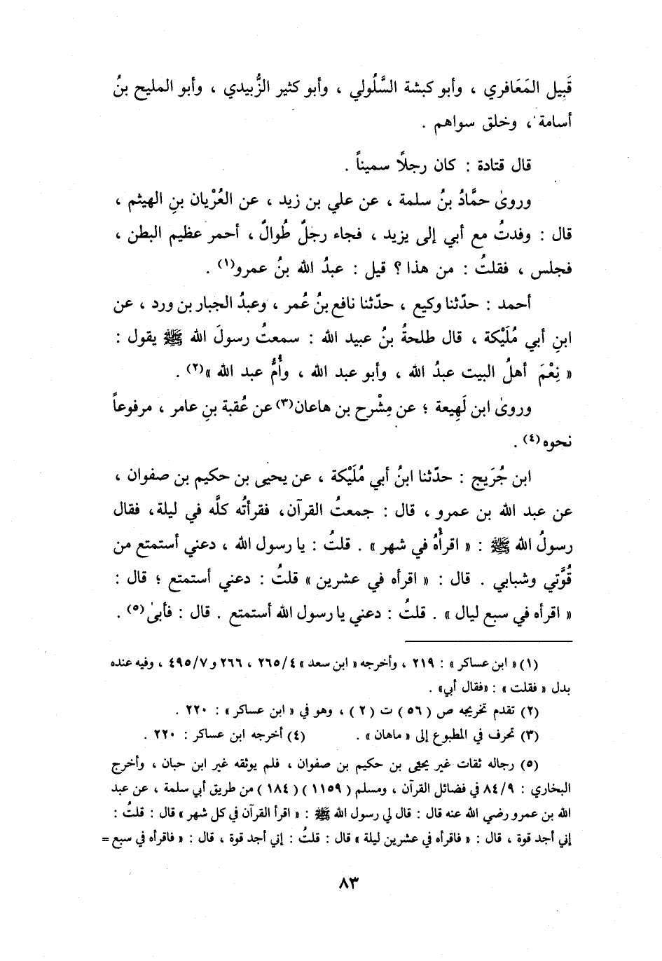 (5) رجاله ثقات غير يحيى بن حكيم بن صفوان، فلم يوثقه غير ابن حبان، وأخرج البخاري: 9 / 84 في فضائل القرآن، ومسلم (1159) (184) من طريق أبي سلمة، عن عبد الله بن عمرو بن رضي الله عنه قال: قال لي رسول الله صلى الله عليه وسلم: " اقرأ القرآن في كل شهر " قال: قلت: إني أجد قوة، قال: " فاقرأه في عشرين ليلة " قال: قلت: إني أجد قوة، قال: " فاقرأه في سبع =