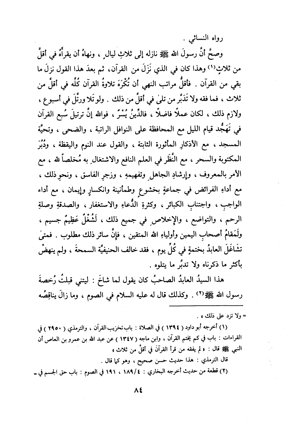 (1) أخرجه أبو داود (1394) في الصلاة: باب تخريب القرآن، والترمذي (2950) في القراءات: باب في كم يختم القرآن، وابن ماجه (1347) عن عبد الله بن عمرو بن العاص أن
