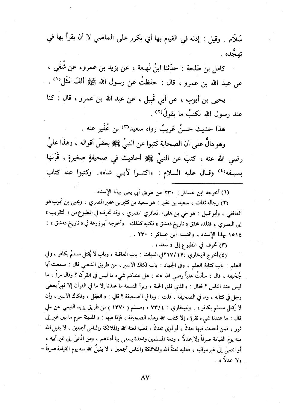 وَهُوَ دَالٌّ عَلَى أَنَّ الصَّحَابَةَ كَتَبُوا عَنِ النَّبِيِّ -صَلَّى اللَّهُ عَلَيْهِ وَسَلَّمَ - بَعْضَ أَقْوَالِهِ، وَهَذَا عَلِيٌّ -رَضِيَ اللهُ عَنْهُ - كَتَبَ عَنِ النَّبِيِّ -صَلَّى اللَّهُ عَلَيْهِ وَسَلَّمَ - أَحَادِيْثَ فِي صَحِيْفَةٍ صَغِيْرَةٍ، قَرَنَهَا بِسَيْفِهِ (4) .