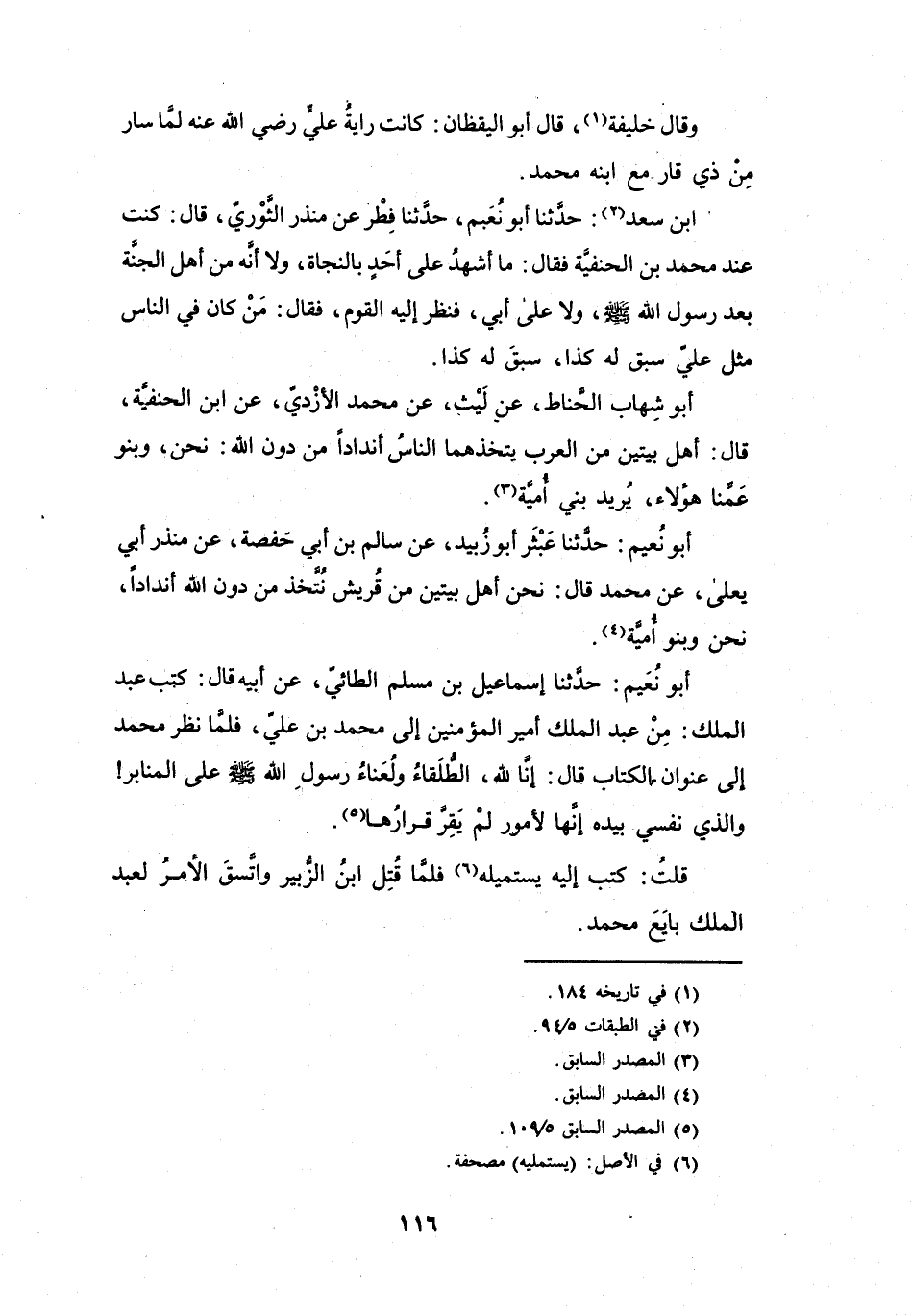 أَهْلُ بَيْتَيْنِ مِنَ العَرَبِ يَتَّخِذُهُمَا النَّاسُ أَنْدَاداً مِنْ دُوْنِ اللهِ: نَحْنُ، وَبَنُوْ عَمِّنَا هَؤُلاَءِ - يُرِيْدُ بَنِي أُمَيَّةَ (3) -.