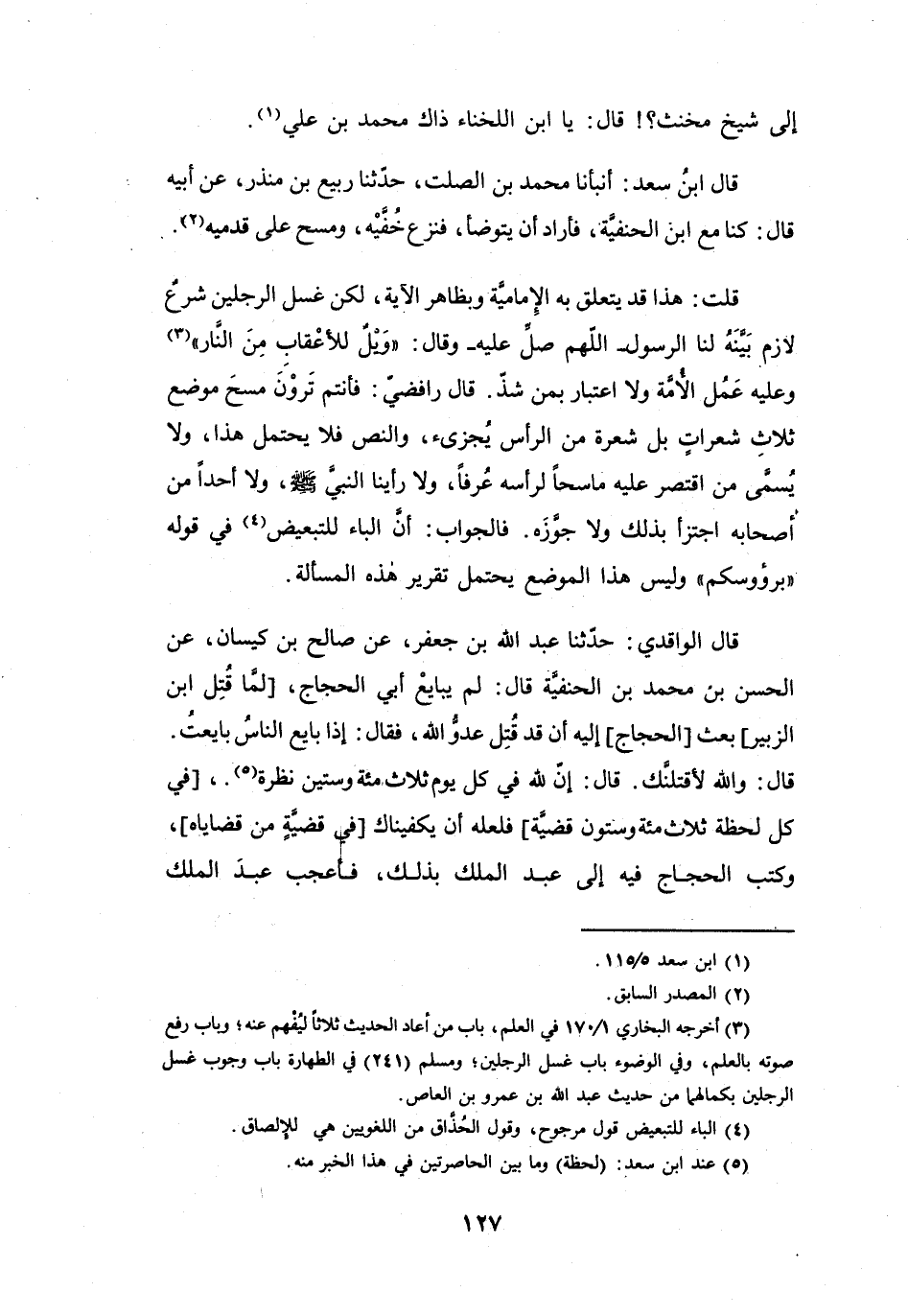 قُلْتُ: هَذَا قَدْ يَتَعَلَّقُ بِهِ الإِمَامِيَّةُ، وَبِظَاهِرِ الآيَةِ، لَكِنْ غَسْلُ الرِّجْلَيْنِ شَرْعٌ لاَزِمٌ، بَيَّنَهُ لَنَا الرَّسُوْلُ - اللَّهُمَّ صَلِّ عَلَيْهِ - وَقَالَ: (وَيْلٌ لِلأَعْقَابِ مِنَ النَّارِ (3)) ، وَعَلَيْهِ عَمَلُ الأُمَّةِ، وَلاَ اعْتِبَارَ بِمَنْ شَذَّ.