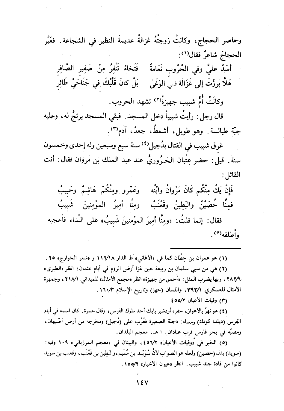 (5) الخبر في " وفيات الأعيان " 2 / 456، والبيتان في " معجم المرزباني " 109 وفيه: (سويد) بدل (حصين) ولعله هو الصواب لان سويد بن سليم، والبطين بن قعنب، وقعنب بن سويد كانوا من قادة جند شبيب.
