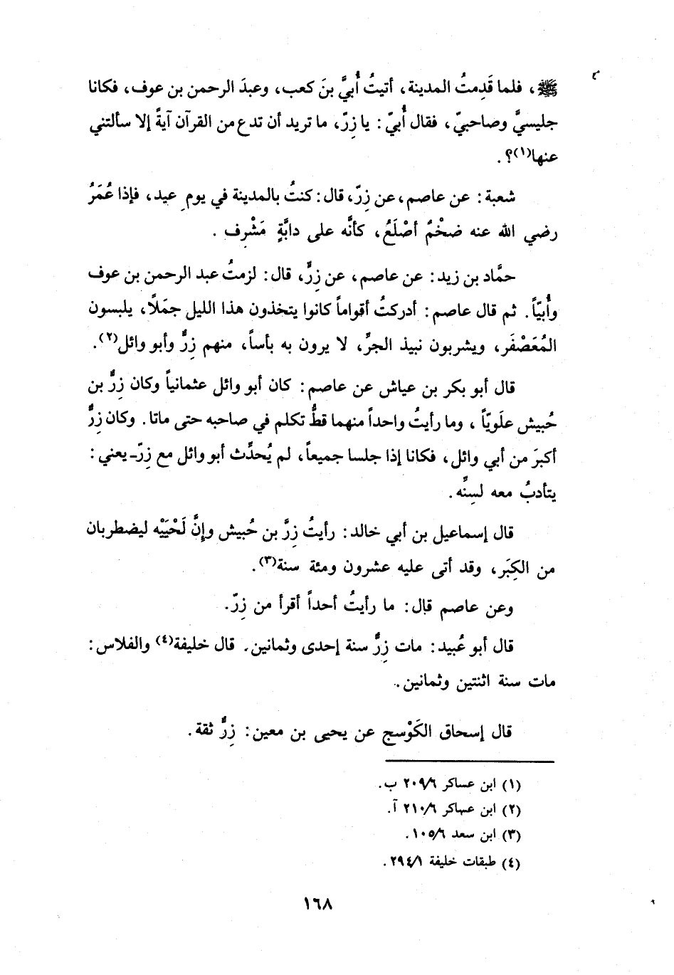 حَمَّادُ بنُ زَيْدٍ: عَنْ عَاصِمٍ، عَنْ زِرٍّ، قَالَ: لَزِمْتُ عَبْدَ الرَّحْمَنِ بنَ عَوْفٍ، وَأُبَيّاً.