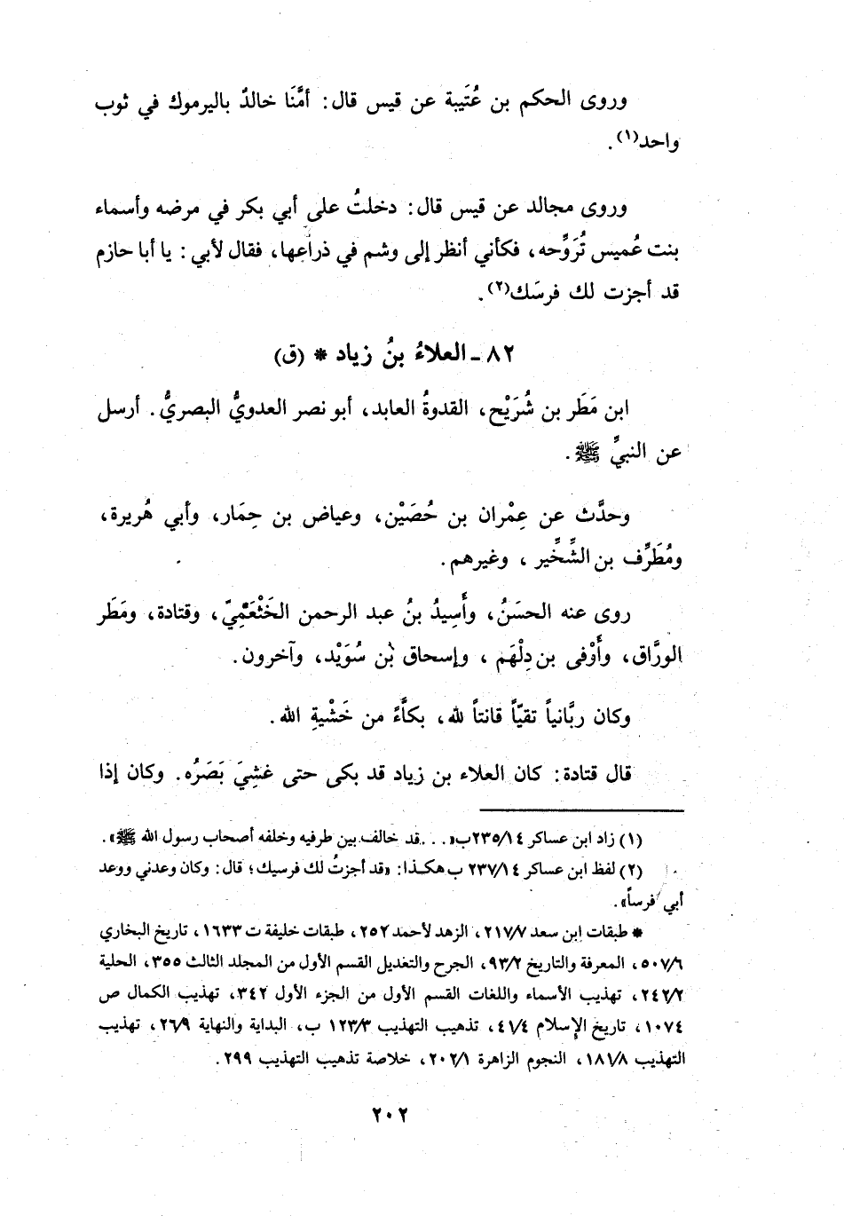 (*) طبقات ابن سعد 7 / 217، الزهد لأحمد 252، طبقات خليفة ت 1633، تاريخ البخاري 6 / 507، المعرفة والتاريخ 2 / 93، الجرح والتعديل القسم الأول من المجلد الثالث 355، الحلية 2 / 242، تهذيب الأسماء واللغات القسم الأول من الجزء الأول 342، تهذيب الكمال ص 1074، تاريخ الإسلام 4 / 41، تذهيب التهذيب 3 / 123 ب، البداية والنهاية 9 / 26، تهذيب التهذيب 8 / 181، النجوم الزاهرة 1 / 202، خلاصة تذهيب التهذيب 299.