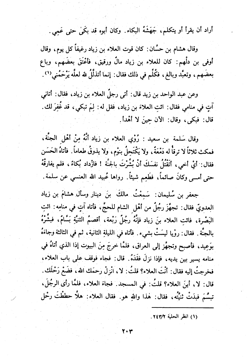 وَقَالَ أَوْفَى بنُ دِلْهَمٍ: وَكَانَ لِلْعَلاَءِ بنِ زِيَادٍ مَالٌ وَرَقِيْقٌ، فَأَعْتَقَ بَعْضَهُم، وَبَاعَ بَعْضَهُم، وَتَعَبَّدَ، وَبَالَغَ، فَكُلِّمَ فِي ذَلِكَ، فَقَالَ: إِنَّمَا أَتَذَلَّلُ للهِ، لَعَلَّهُ يَرْحَمُنِي (1) .